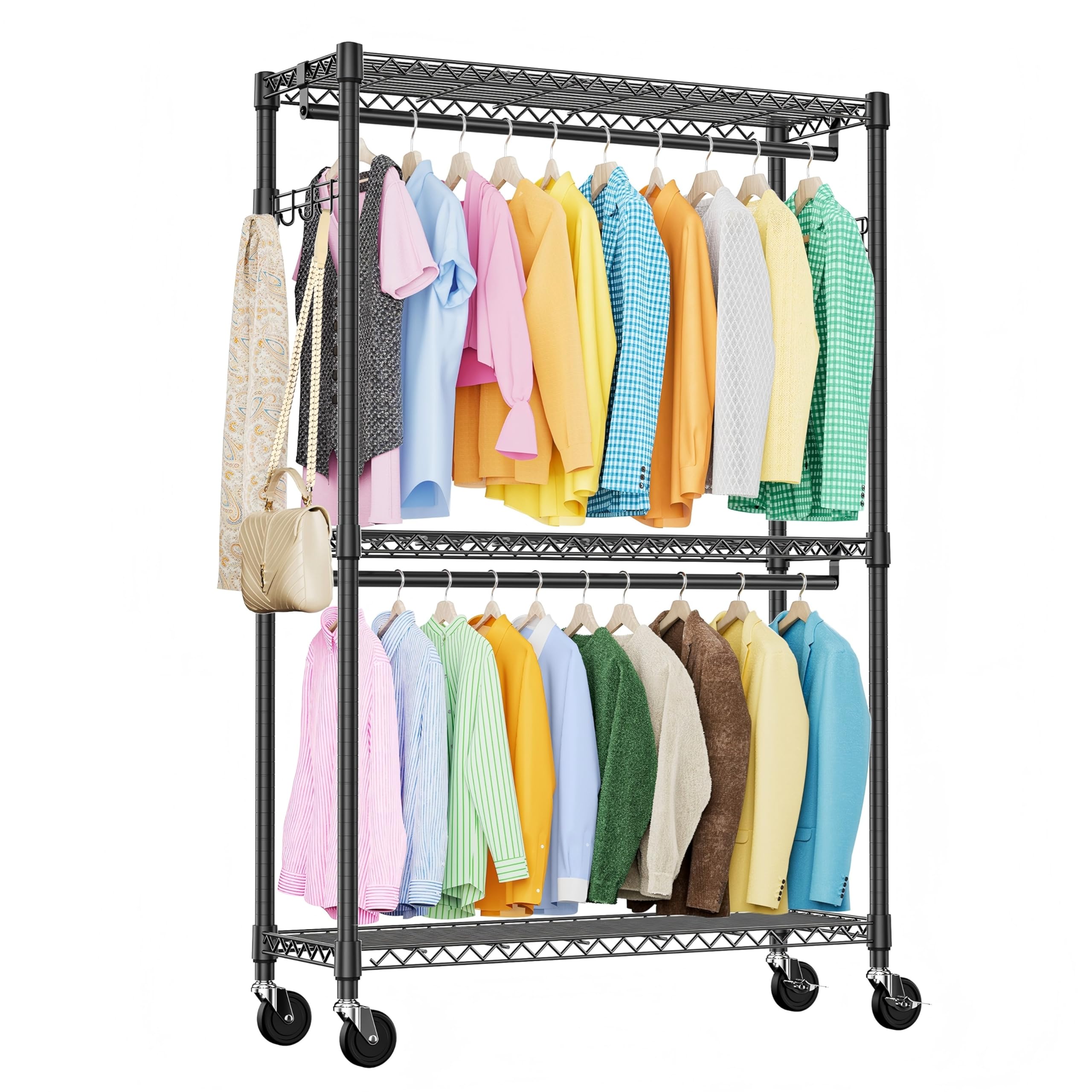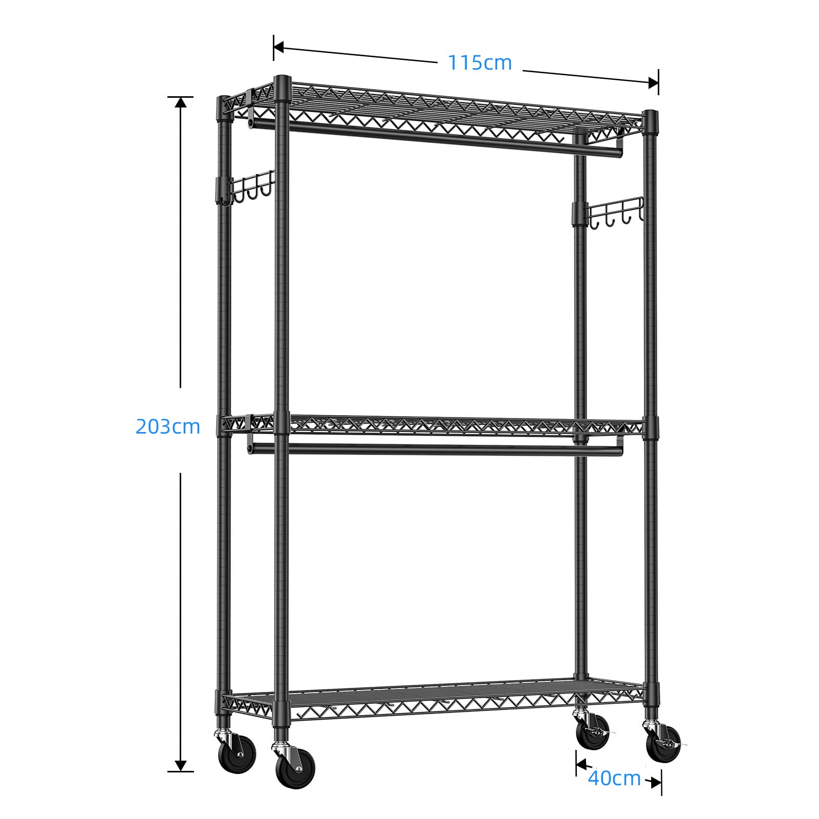 IZEUK ハンガーラック キャスター付き3段 押入れ ハンガーパイプ付き ガーメント ラック ハンガー 多機能収納 工具付属 突っ張りポールハンガー ダブル ハンガー ラック 高耐荷重 耐久性 頑丈 衣類ラック ワイヤー衣類ラック 金属製自立式 防錆 クローゼットワードローブ 車輪付/4個アジャスター付属 幅115×奥行40×高さ202cm(車輪を含む高さ) 管径22.2mm ブラック