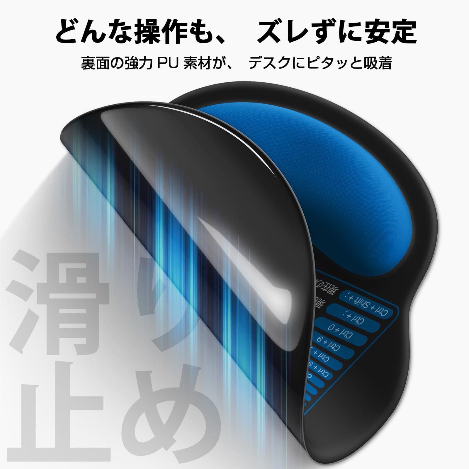 PU素材の滑り止め加工|しっかり固定でズレにくい : 裏面にはPU製の滑り止め素材を採用。机にしっかりフィットし、激しい操作でもマウスパッドがズレにくいため、集中して作業に取り組めます