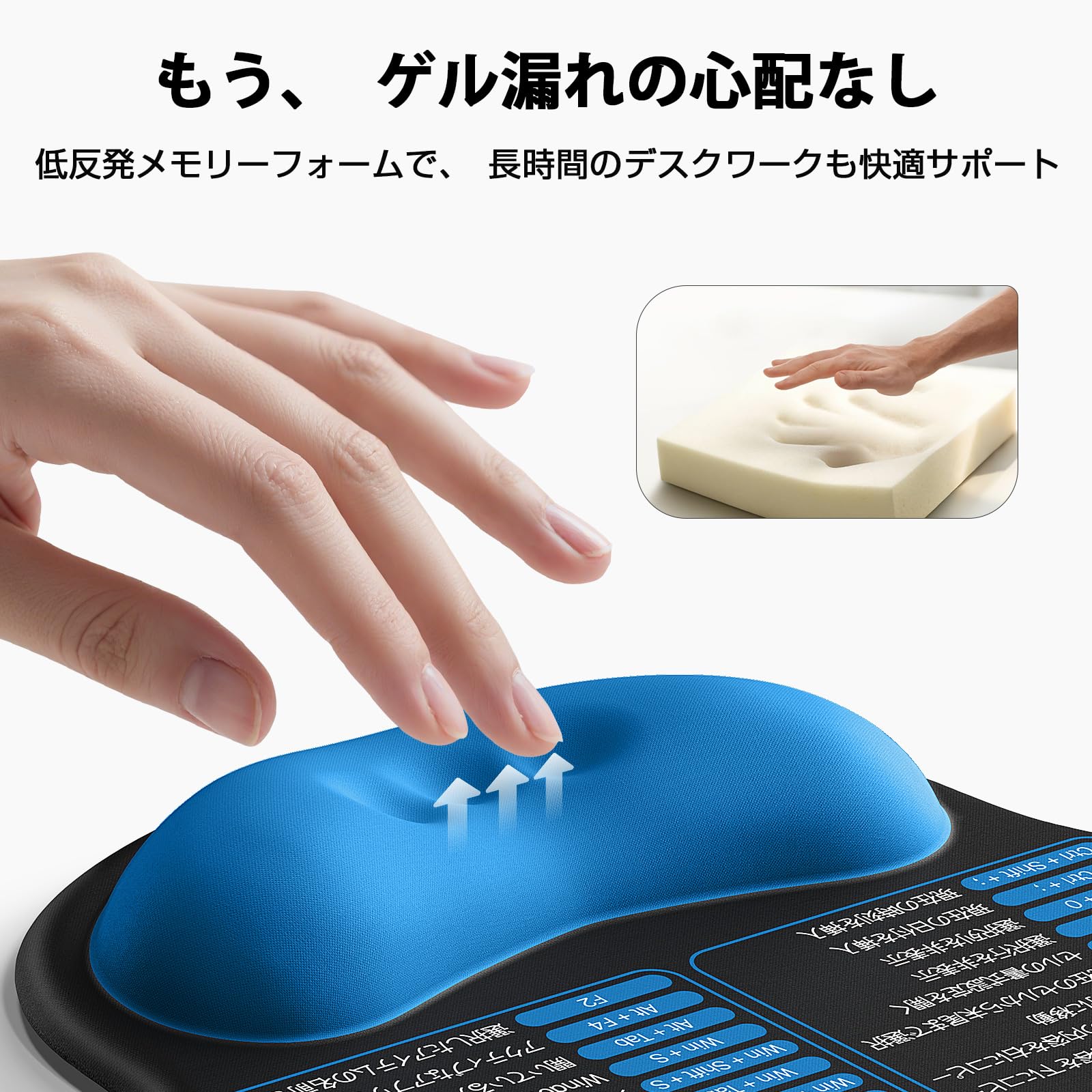 ジェルではなく低反発メモリーフォーム使用|漏れの心配なしで安心 : リストレスト部分にはジェルではなく、高品質な低反発メモリーフォームを採用。ジェルタイプにありがちな液漏れや破損のリスクがなく、長期間にわたって安心してご使用いただけます。やわらかく手首にフィットし、快適さも抜群です