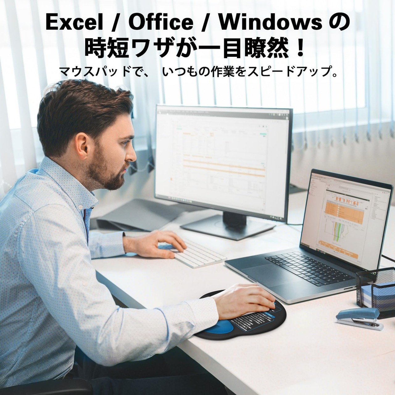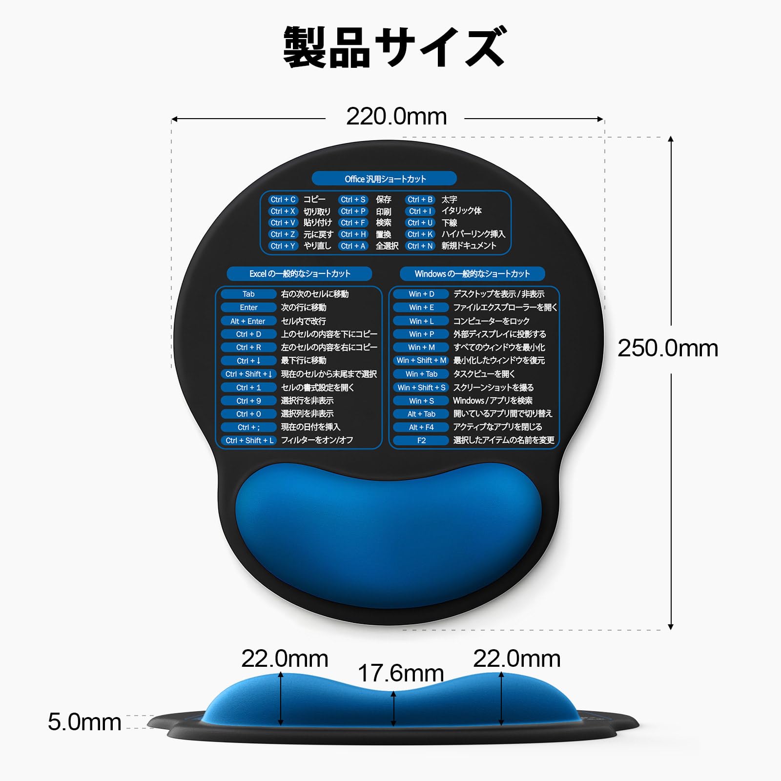 便利なショートカットキー印刷|オフィス作業効率アップ : マウスパッド表面には、Windows、Excel、Officeなどで使えるよく使うショートカットキーを印刷。作業中にすぐ確認できるので、作業スピードの向上や時短にも役立ちます