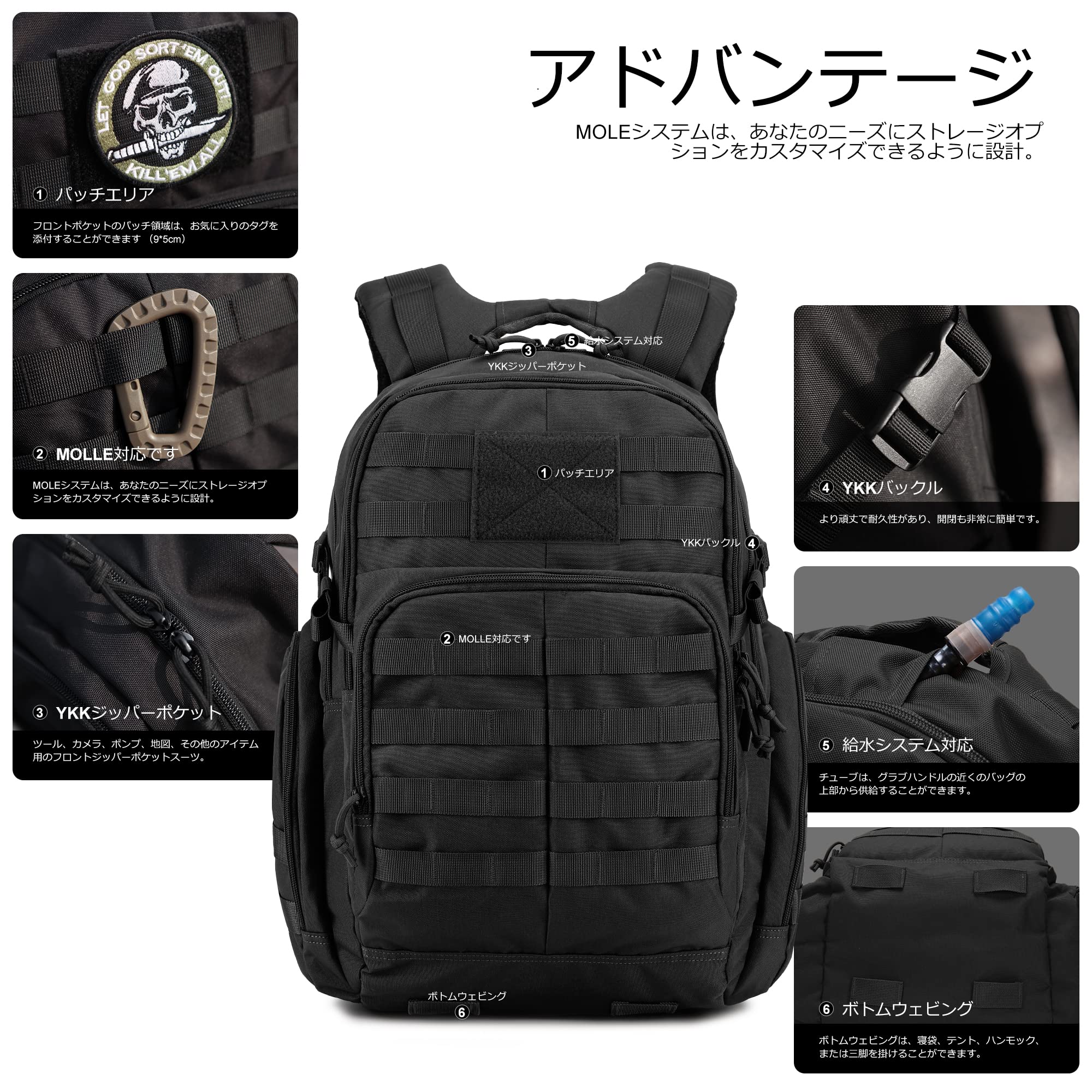 600D耐水ポリエステル&YKKジッパーで過酷環境も耐久性抜群。40L大容量+多ポケットで収納楽々。全身MOLLEパネル/フックでポーチやギア自在拡張(サイド水筒収納可)。メッシュ立体背面板で通気性確保。調節可能な3点ストラップ(肩・腰・胸)で負荷分散し、長時間快適。防災・アサルト・トレッキングから通学・日常まで幅広く対応。