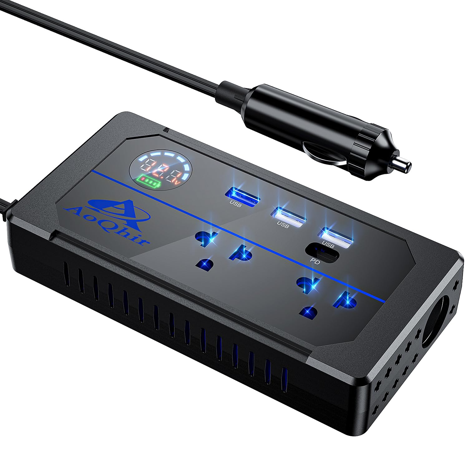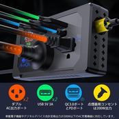 多様な出力ポート:このインバーターには、2つのAC出力ポート、1つのQC3.0ポート、1つのPDポート、および2つのUSB 5V3Aポートとシガーソケットポートが装備されています。車載製品やデジタル機器など、さまざまなデバイスの充電や給電ニーズに対応できます