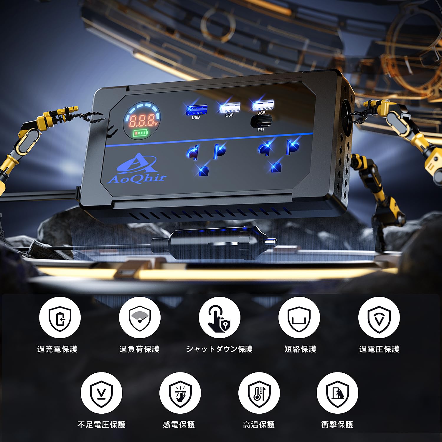 多重保護機能:ユーザーの安全と機器の安定した動作を確保するために、このインバーターには過充電、ショートサーキット、過負荷、過電圧、低電圧、感電、高温、衝撃などの多重保護機能が備わっています。これにより、いかなる予期しない状況でも、インバーターが自動的に電源を切断し、機器や車両の電気系統を保護します