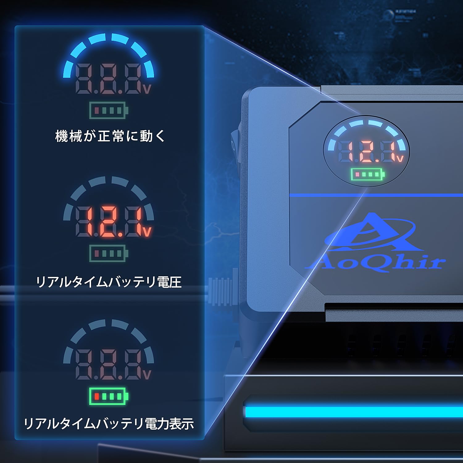 スマートディスプレイ:このシガーソケットには、スマートディスプレイが装備されており、通電時の電圧の状態をリアルタイムで表示します。起動後、正常な電圧範囲は11.6Vから16.0Vの間にあり、非起動時の正常な電圧範囲は11.6Vから12.8Vの間です。もし電圧が11.6V未満の場合、ディスプレイはユーザーに故障の可能性を確認するよう促し、安全な使用をします
