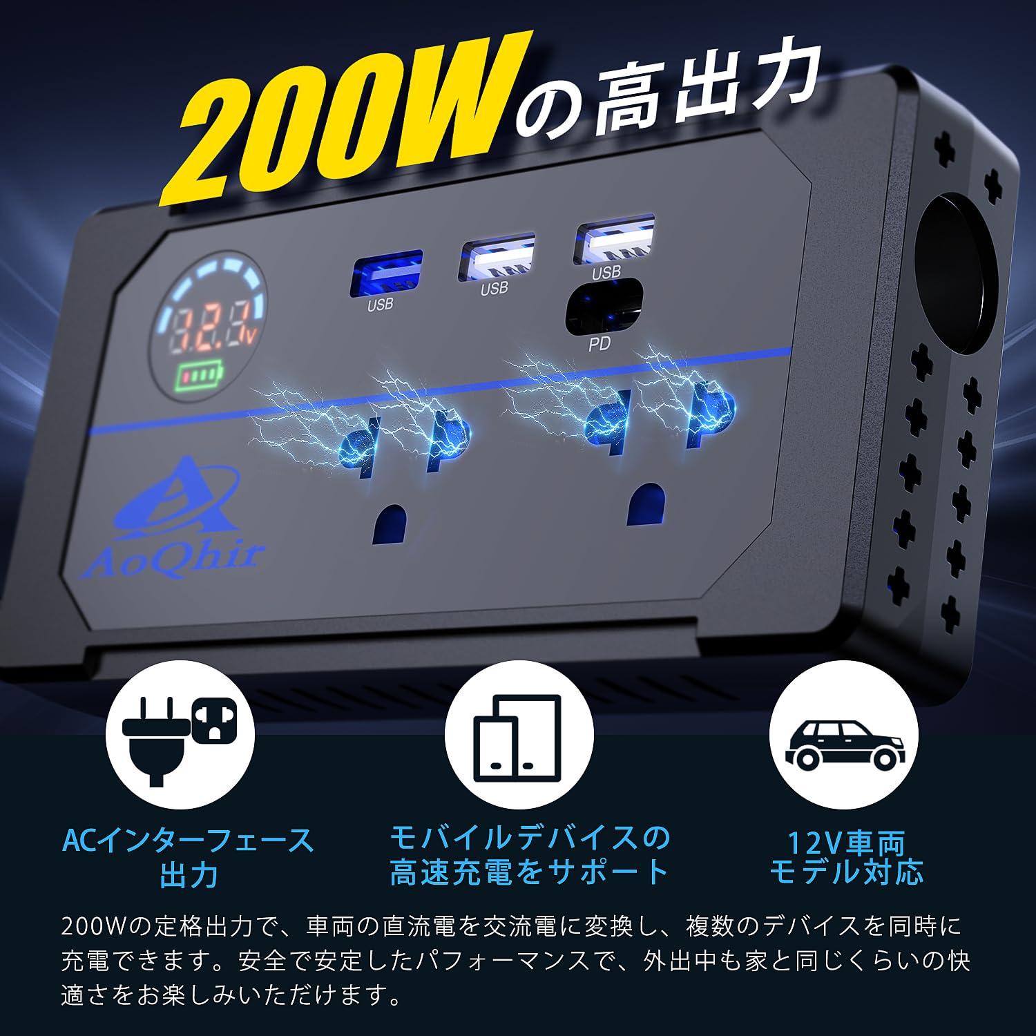 高功率输出:この車載電源インバーターは、最大200Wの高出力を提供し、ノートパソコン、タブレット、スマートフォン、車載炊飯器、車載冷蔵庫、携帯用ファン、車載掃除機、車載湯沸かしポットなど、複数のデバイスに同時に電力を供給できます。旅行中にさまざまな電子機器を使用したり、車内で食べ物や飲み物を準備したりする必要がある場合でも、このインバーターを使えば必要な電力を手軽に得ることができます