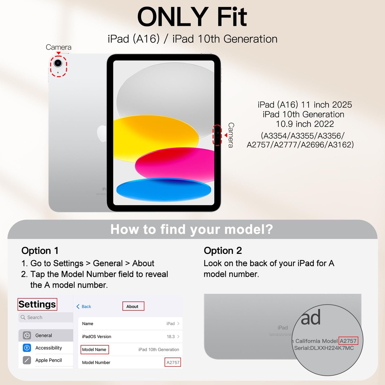 [互換性] iPad(A16)ケース 第11/10世代(2025/2022モデル)用の特別デザインです。対応モデル:A3354 / A3355 / A3356 / A2696 / A2757 / A2777 / A3162。「設定」>「一般」>「情報」の順に選択します、「モデル番号」フィールドをタップしてAモデル番号を表示します。注: Pencil第1世代の磁気吸着には対応していません