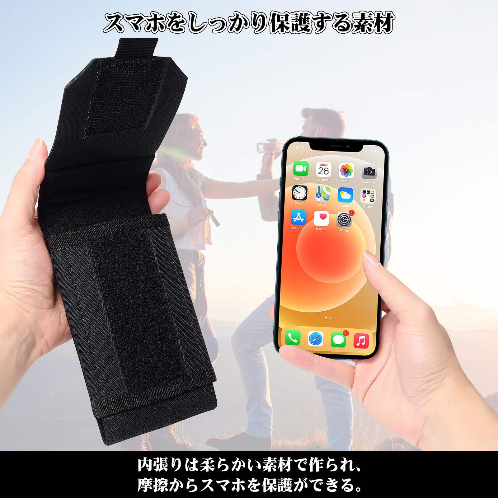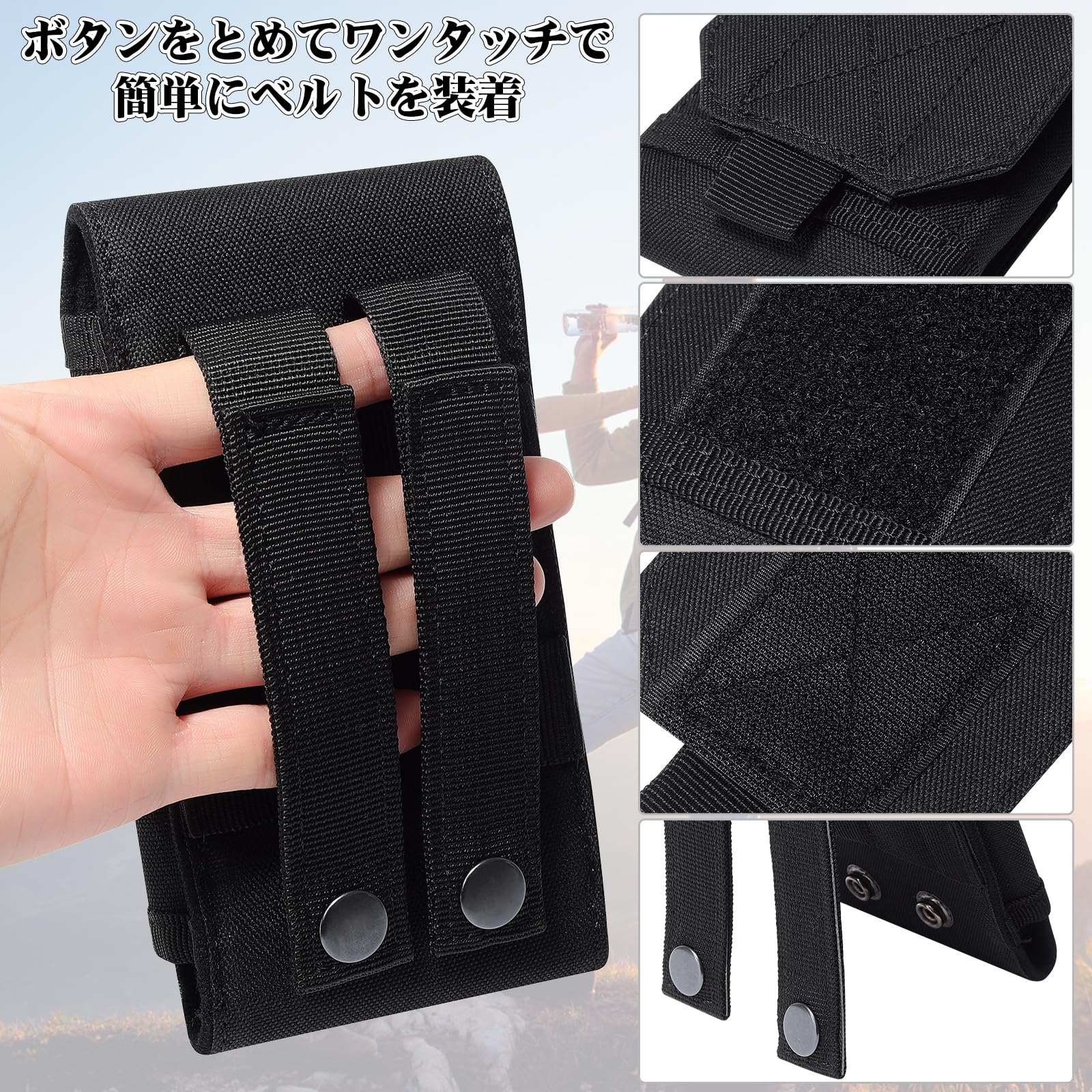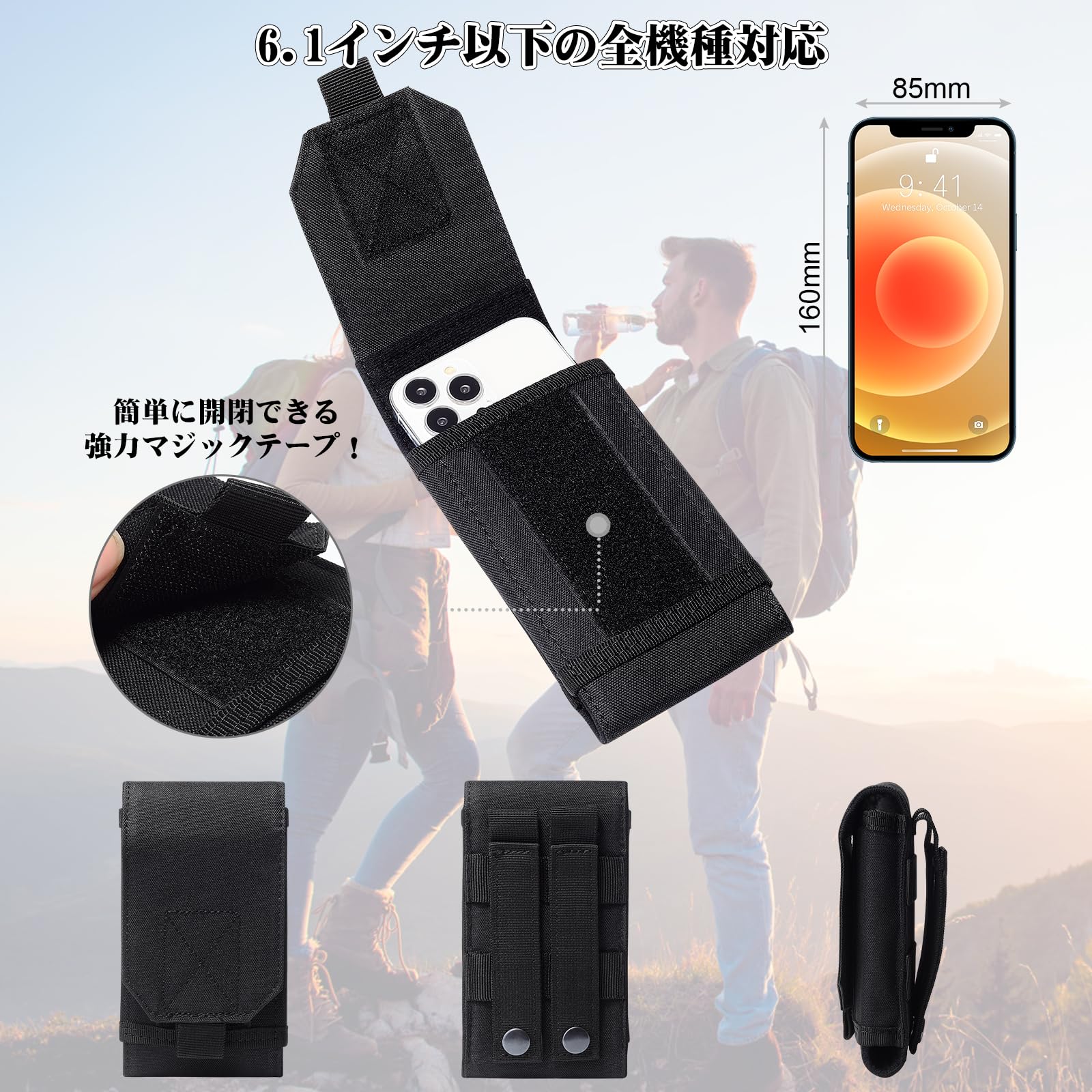 仕様:留め具は粘着的なマジックテープ仕様、サイドは伸縮性があるデザインのおかげで、ケース装着 6.0インチ以内のスマホあるいはほかのサイズ同じぐらいデジタルカメラなどの小物も何でも収納できます。背面にベルトストラップ付きで、Molleモール対応したベルト、ベストに取り付けることができます。