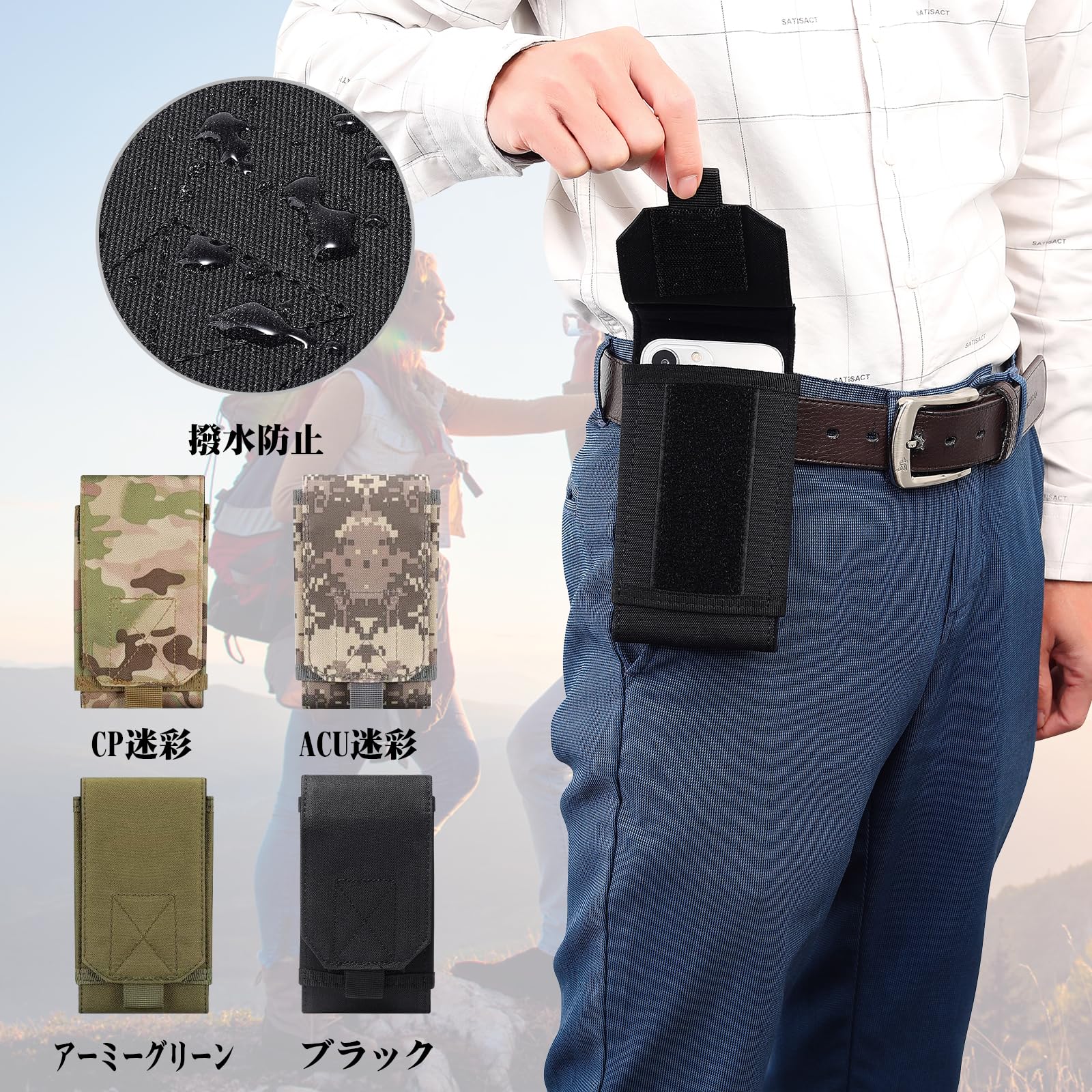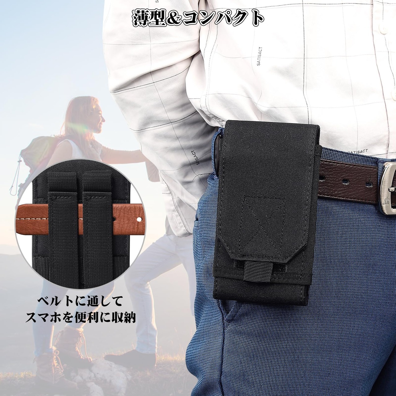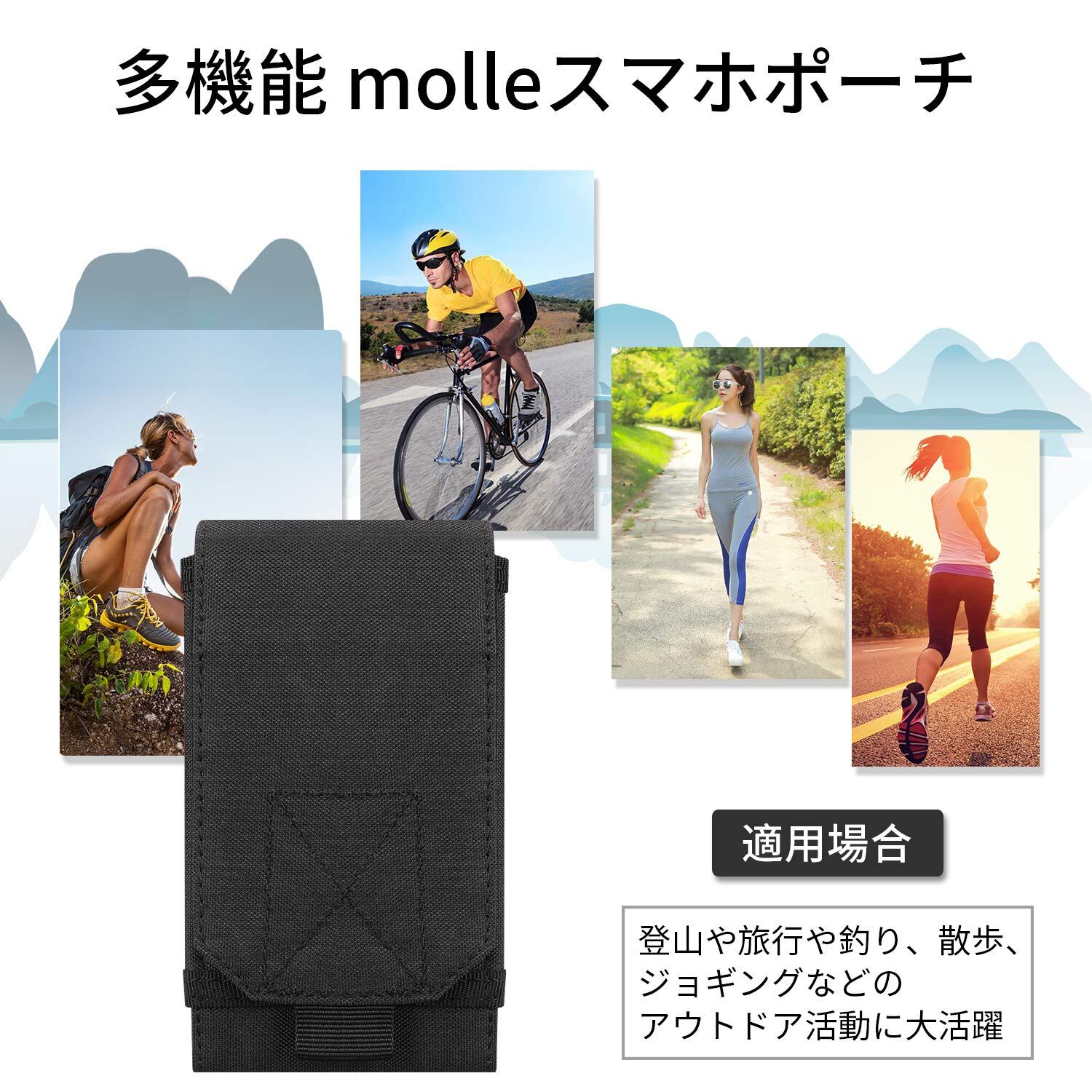 仕様:留め具は粘着的なマジックテープ仕様、サイドは伸縮性があるデザインのおかげで、ケース装着 6.0インチ以内のスマホあるいはほかのサイズ同じぐらいデジタルカメラなどの小物も何でも収納できます。背面にベルトストラップ付きで、Molleモール対応したベルト、ベストに取り付けることができます。