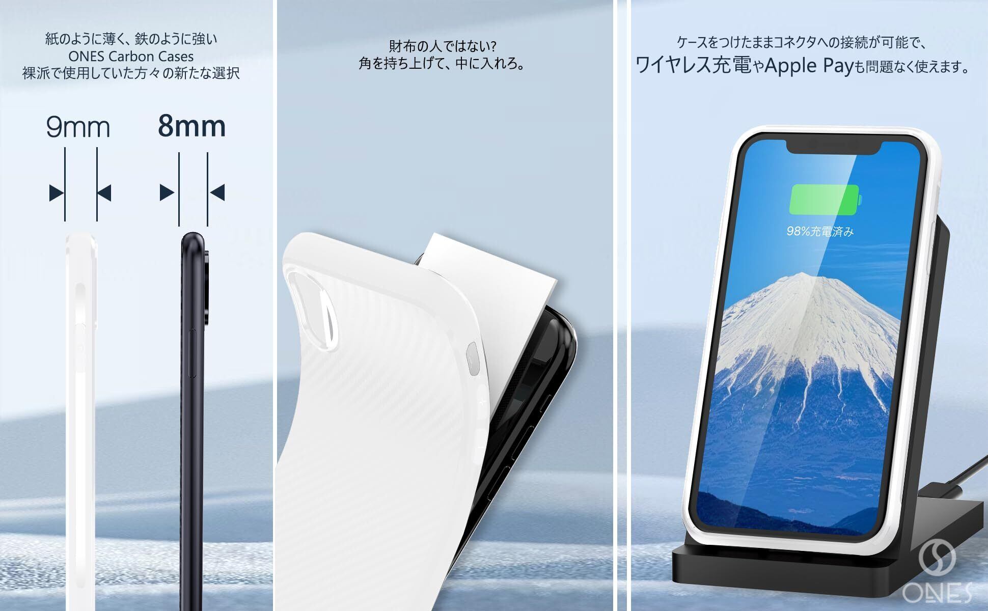 【 画面·レンズ保護 & 超薄型·超軽量 】 薄さ0.85mm、重さ21g。ケースを装着していないかのように軽く、薄い装着感で iPhone XR をしっかり保護します。紙のように薄く、鉄のように強いこの ONES Carbon Cases は今までスマートフォンを裸派で使用していた方々の新たな選択肢となりうるでしょう。本体保護に関するこだわりを詰め込んでいます。エアクッションテクノロジーでケース角に空気が入る空間を設計し、特に衝撃に弱いケース角を守ります。ケース内側には水滴パターンを配置し、落下時の衝撃をケース全体に分散します。フチを一段高く設計することで、カメラやスクリーンがテーブルや床にぶつかり傷つくことがありません。