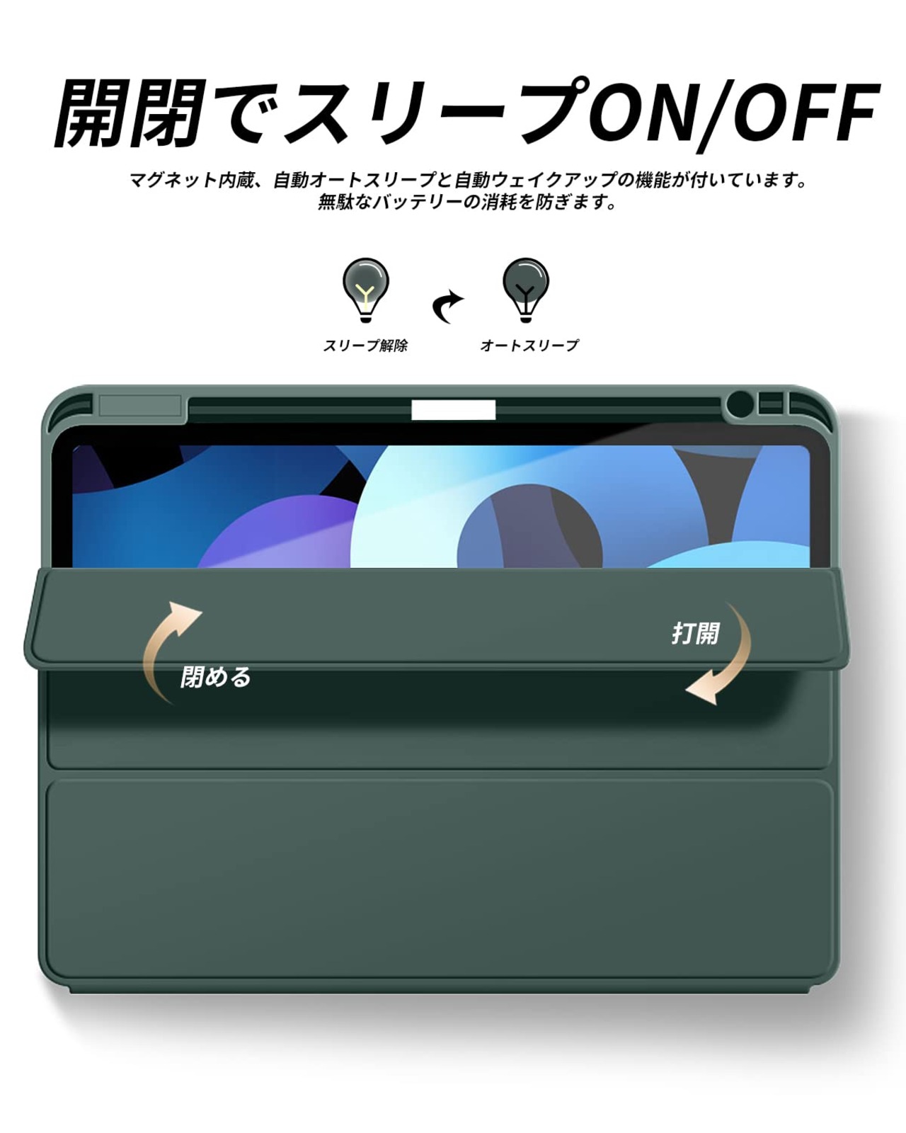 【オートスリープ/ウェイク機能】オートスリープ機能でカバーを開ける閉めることで電源自動的にオン・オフなります、使いやすく、省エネです。マグネット内蔵されているためカバンに入れてもカバーが勝手に開けることを心配必要なくしっかり閉められます。