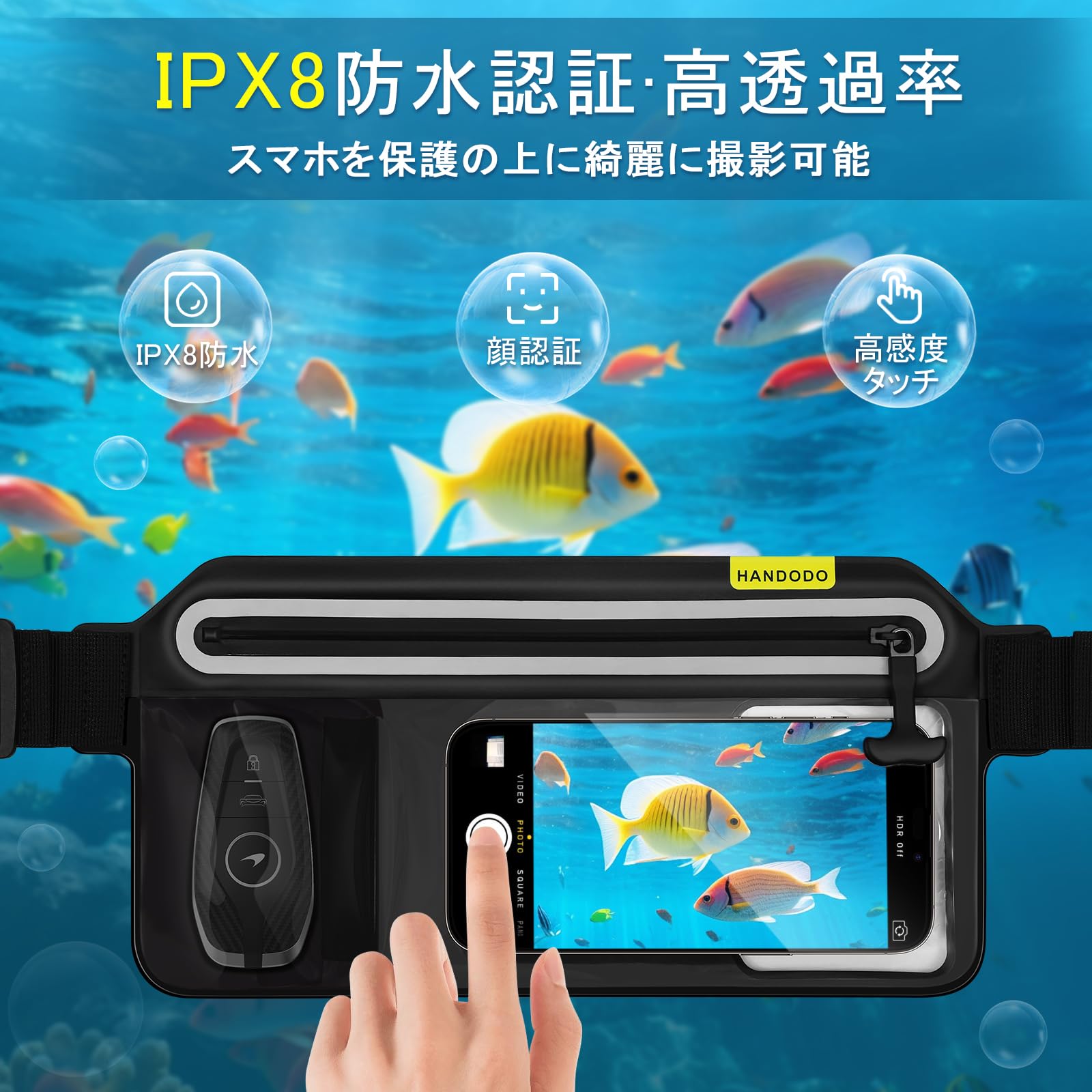 【数量限定】Handodo スマホ 防水ケース IPX8完全防水 ウエストポーチ タッチ可能 指紋認証/顔認証対応 水中撮影 高透過率 長さ調整可能 iPhone/Android 7.0インチ以下全機種対応 海 プール 釣り 山登り お風呂 ハイキング アウトドアに活躍できる