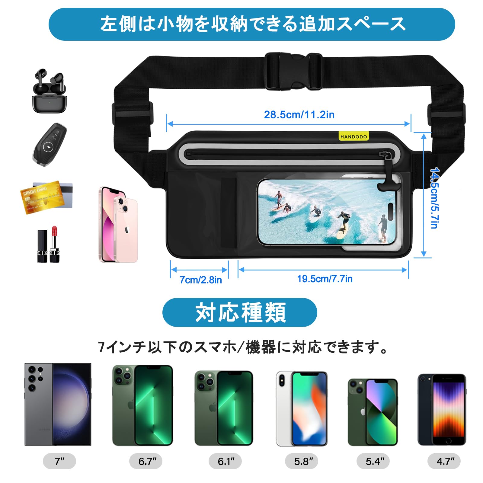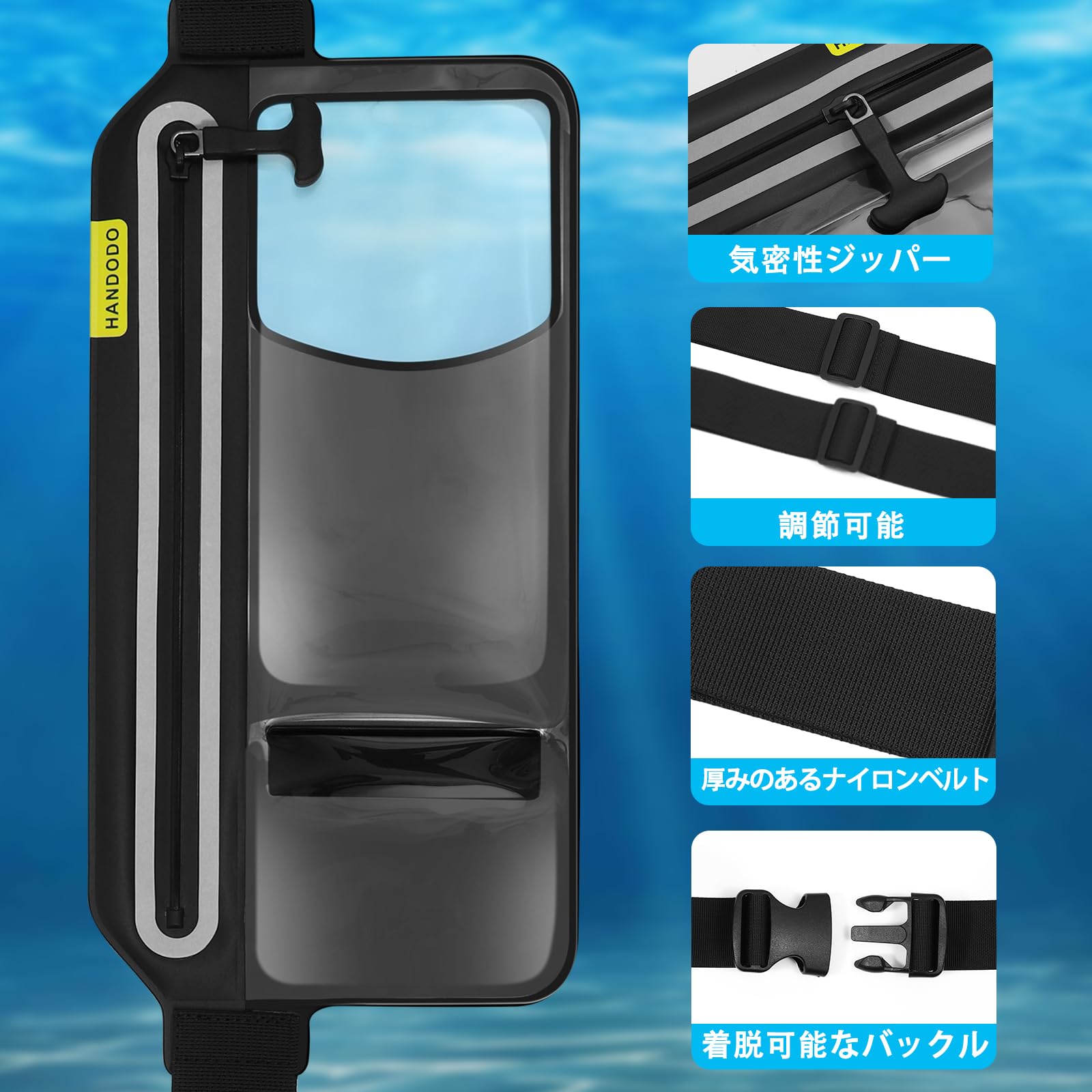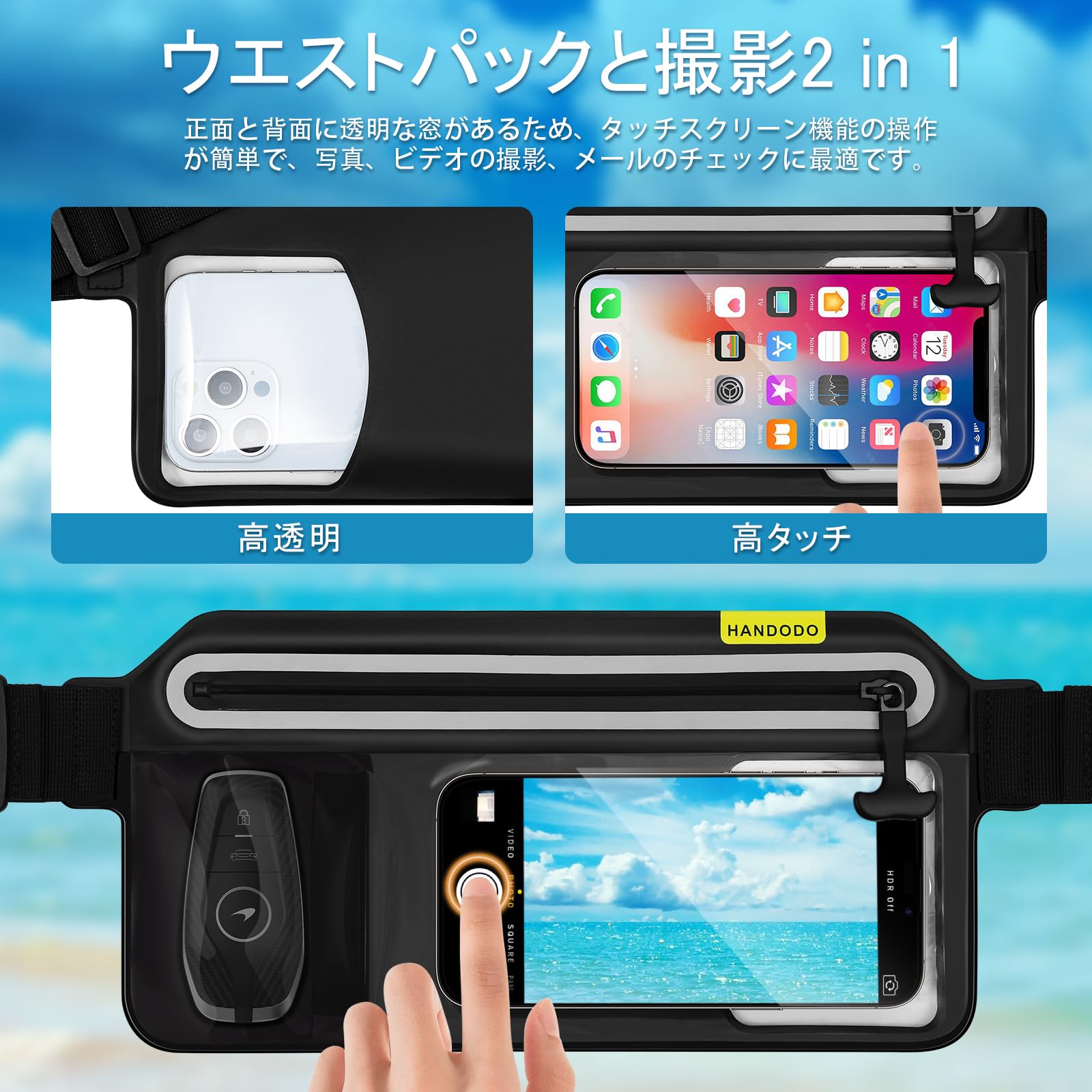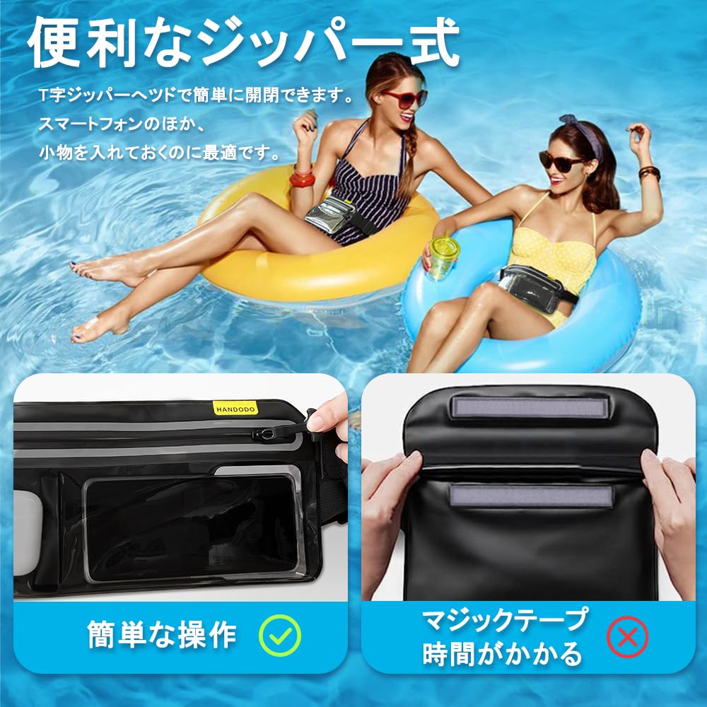 Handodo スマホ 防水ケース IPX8完全防水 ウエストポーチ タッチ可能 指紋認証/顔認証対応 水中撮影 高透過率 長さ調整可能 iPhone/Android 7.0インチ以下全機種対応 海 プール 釣り 山登り お風呂 ハイキング アウトドアに活躍できる