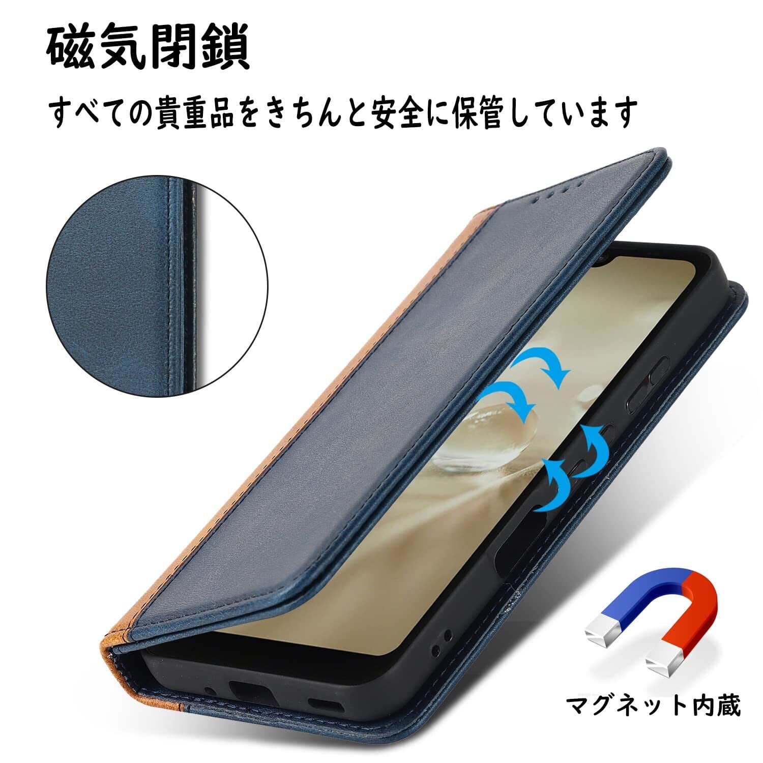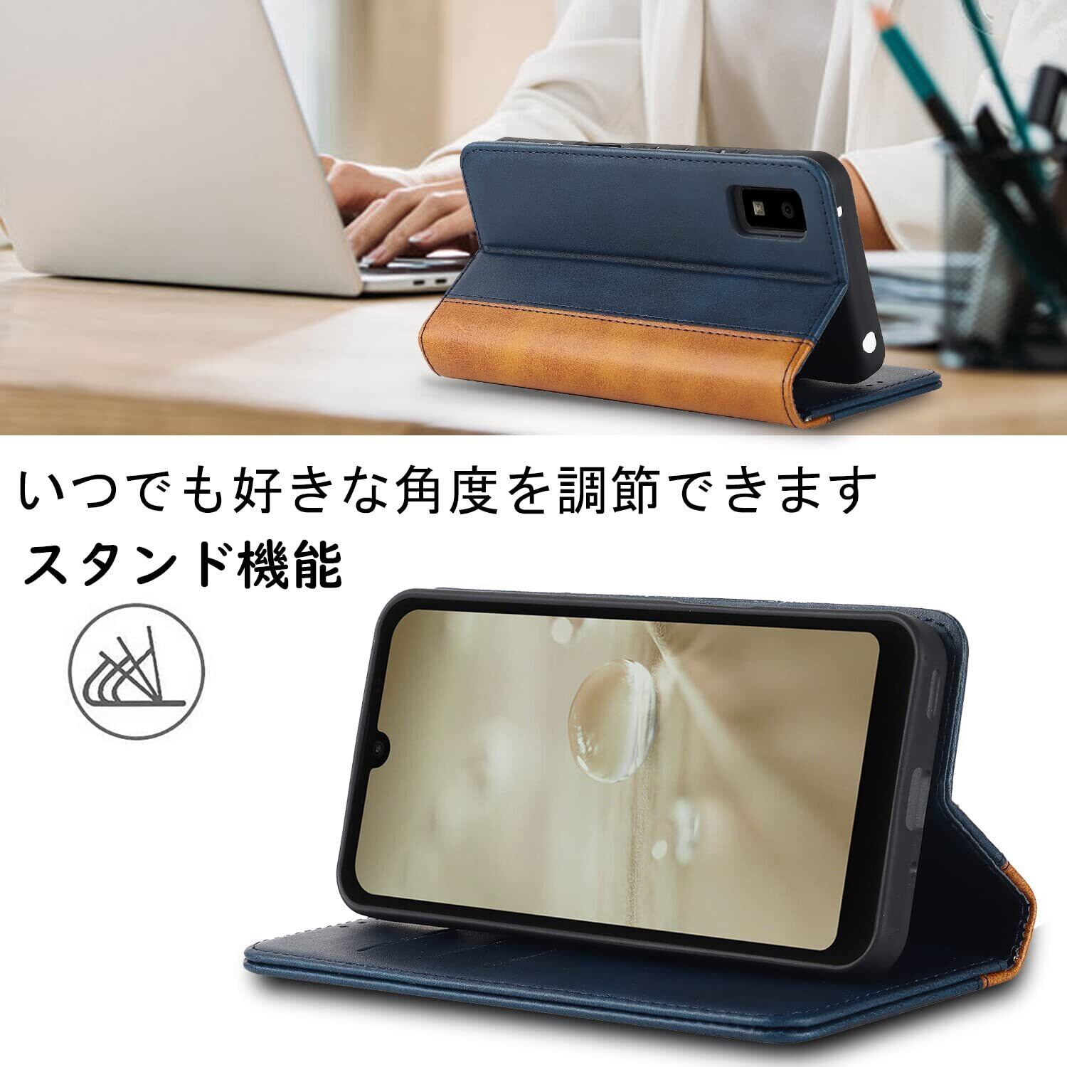 【収納機能】AQUOS wish(SHG06/SH-M20/A104SH)/wish2(SH-51C/A204SH)ケース内側には三つのカード入れとフリーポケットがつき、カード類や紙幣、名刺などが収納できます。カードスロットに2枚のカードを入れると、内蔵マグネットの機能を最大限に発揮し、カードが消磁されるのを防ぐことができます。横置きスタンド機能が付き、横向いて斜めに立てて、自由に角度を調整して、お好みの角度で動画鑑賞や読書などを楽しめます。長時間での新幹線、飛行機の中での暇つぶしに最適です。