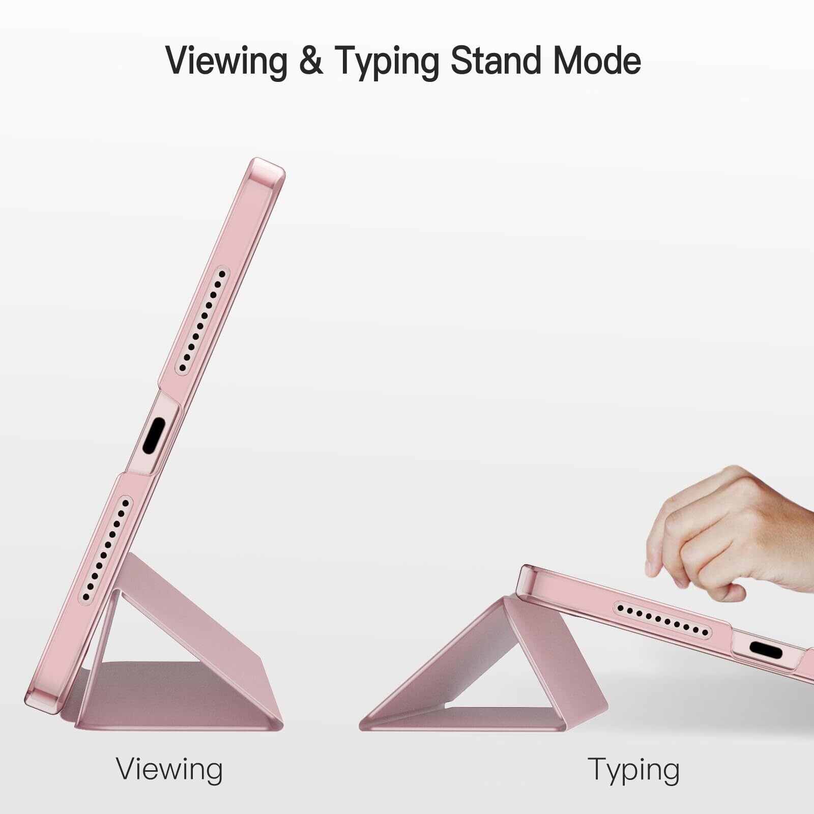 マグネット内蔵、オートスリープとオートウェイクアップ機能が付きます。三つ折りフロントカバーにより、視聴とタイピングに合わせた2つスタンド角度を調整できます
