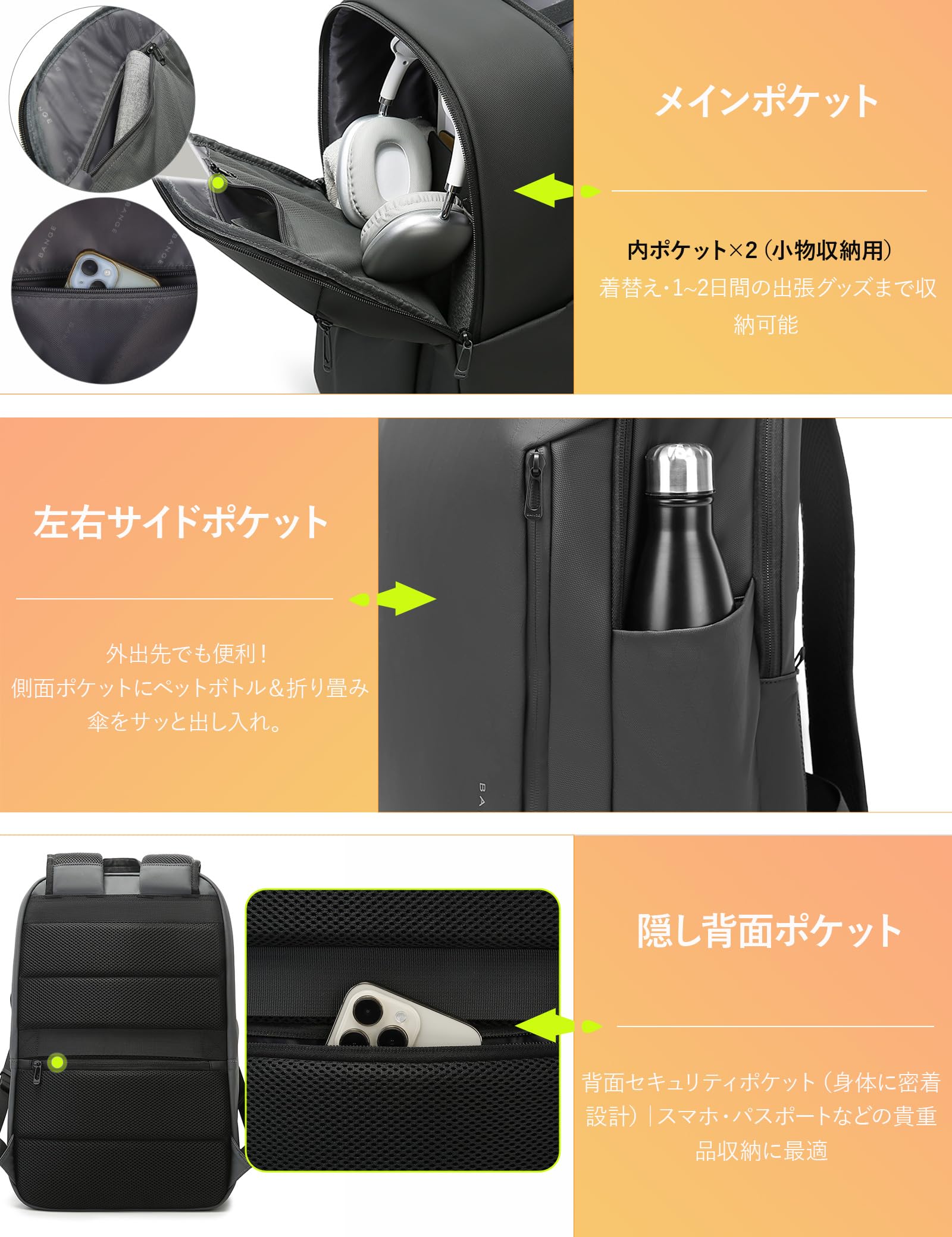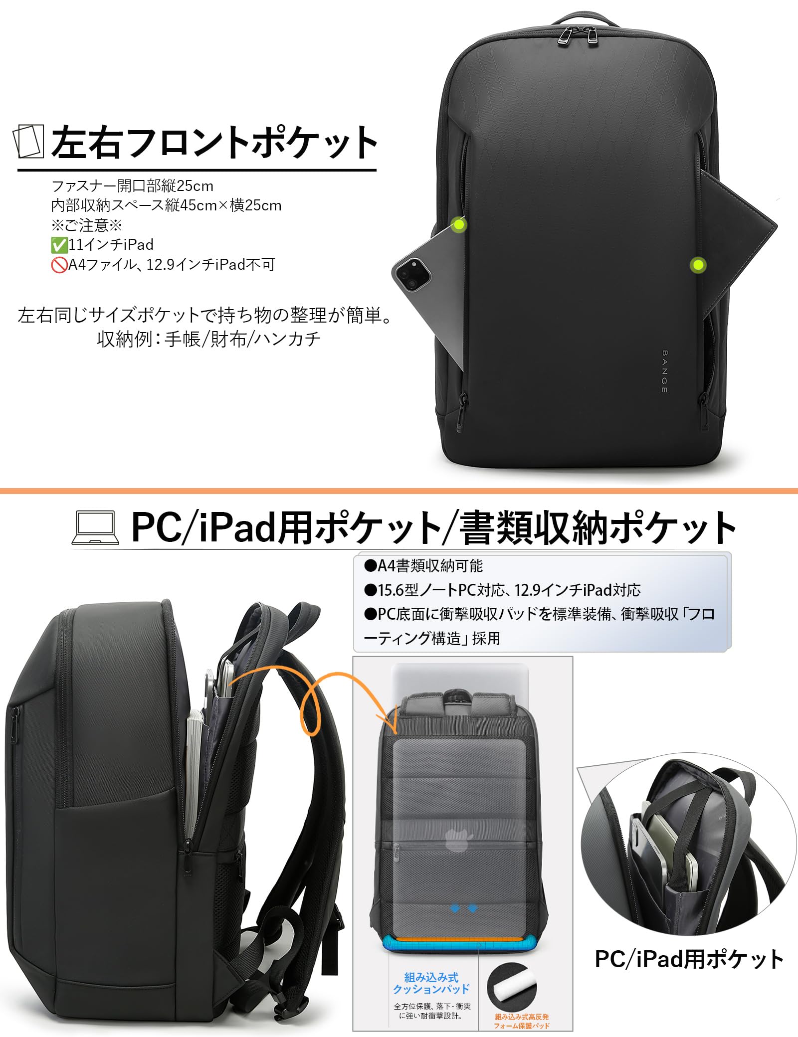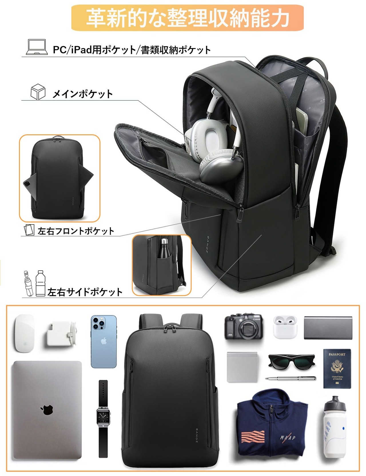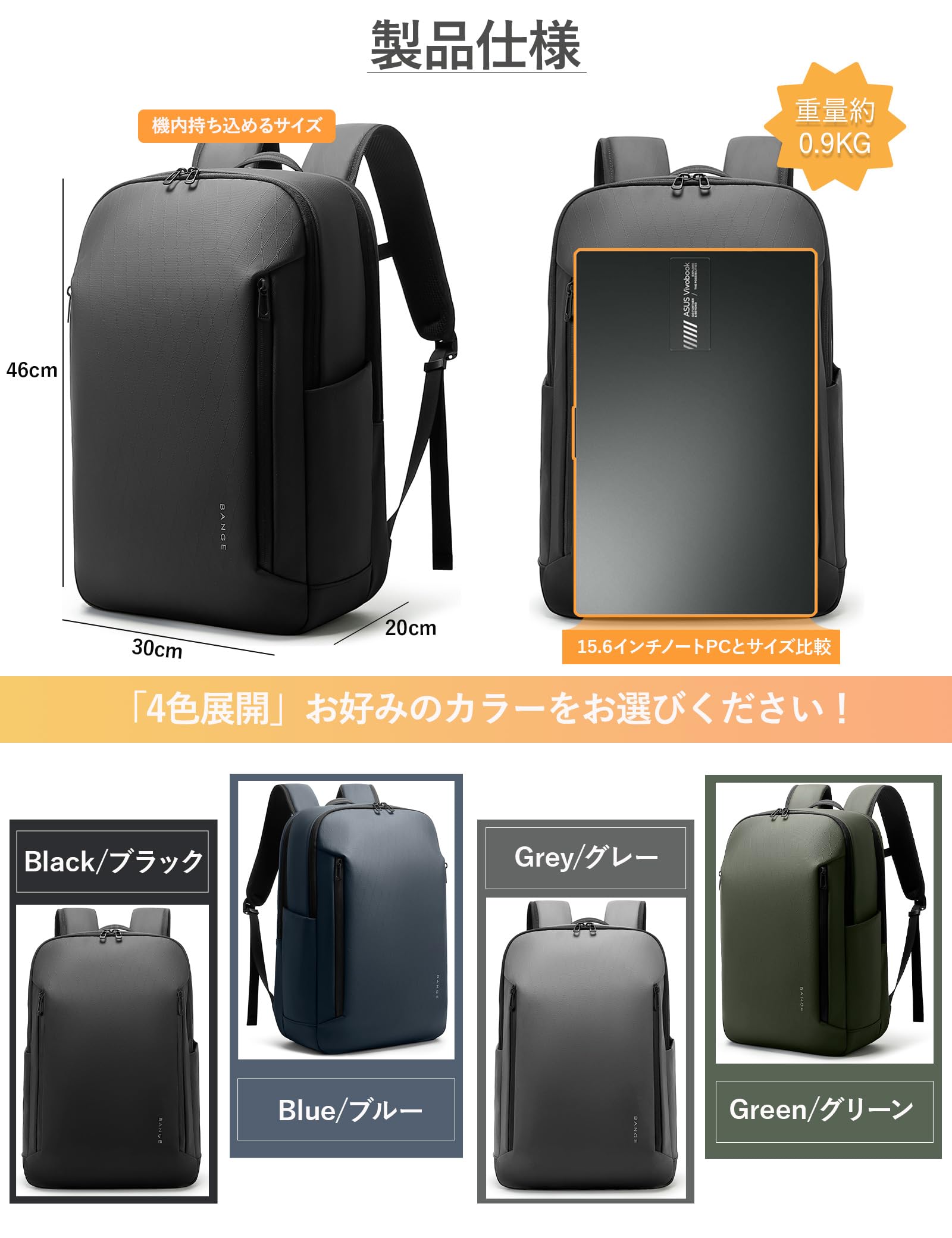 【28L大容量・機内持込】サイズ:縦46cm×横30cm×マチ20cm、重量約0.9kg。メイン収納部、PC収納ポケット、書類収納ポケット、サイドポケット、フロントポケットを備えたビジネスリュックです(11ポケットで整理整頓)。メイン収納部には1~2泊分の着替えを収納可能。タウンユースからアウトドア、通学・ビジネスシーンまで、あらゆるシーンで活躍するマルチユースバッグ。アクティブな日常を快適にサポートします。