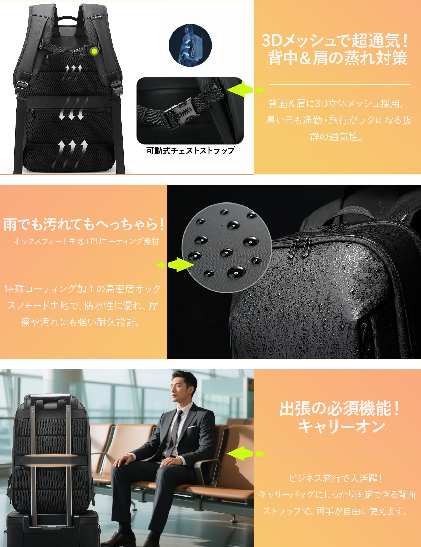 【撥水加工・オックスフォード生地】高密度オックスフォード生地+PUコーティング生地が雨粒を弾き、内部まで水が浸透する心配を解消。水滴や汚れを寄せ付けない撥水加工で、突然の雨の中でも書類や電子機器を確実に保護。