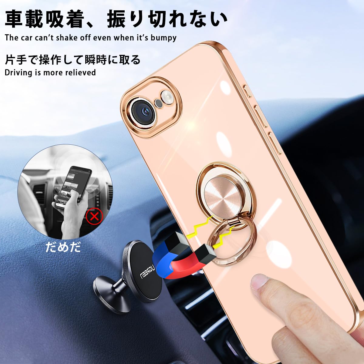 【車載スタンド対応&ストラップ穴付き】内部には金属が内蔵され、マグネット式車載スタンドに対応。*特別ヒント:リング部分は金属ですので、ワイヤレス充電できません。ケースの側面にはストラップホールを搭載しているので、お好きなストラップを付けられ、落下防止にも効果的です。iPhone 16e ケース