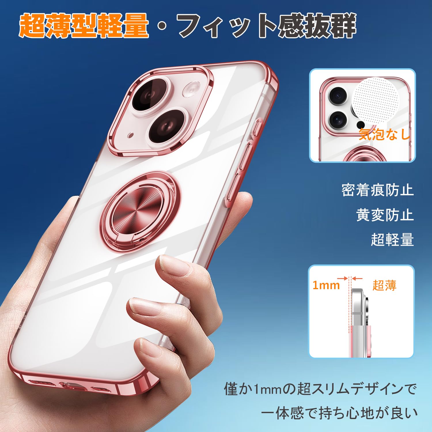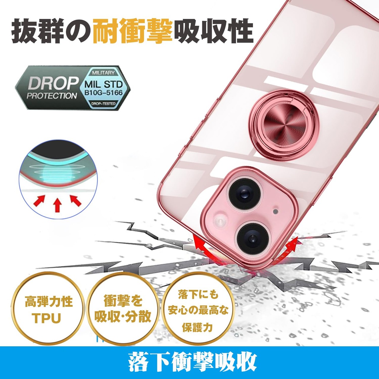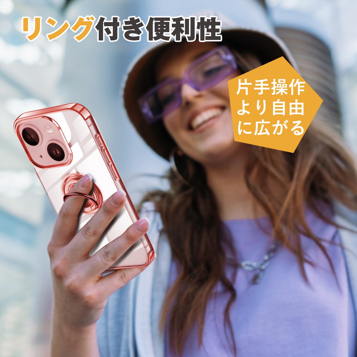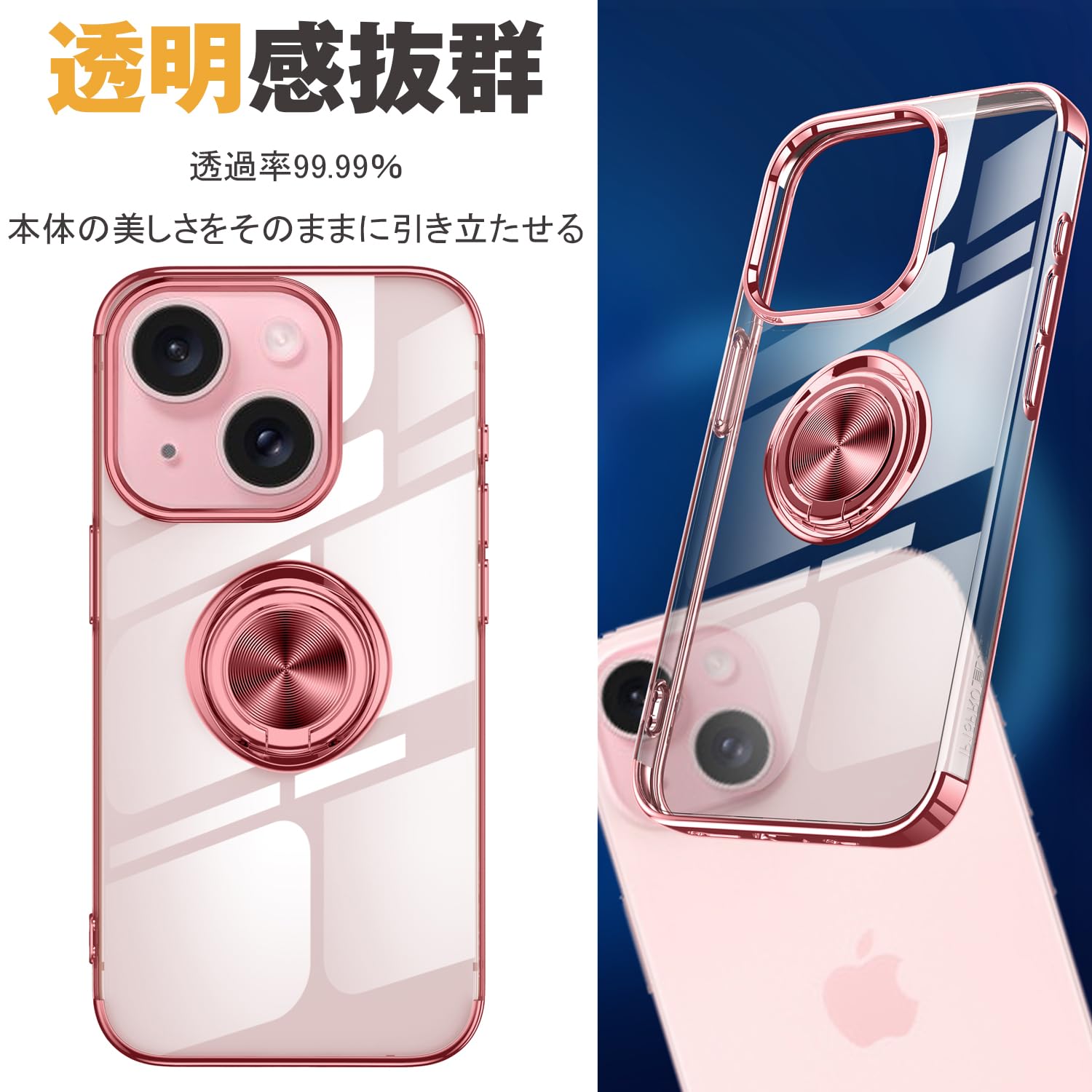 iPhone 15 適用 ケース クリア リング付き アイホン 15 カバー 透明 おしゃれ OURJOY スマホケース メッキ加工 ソフトケース 耐衝撃 軽量 薄型 ストラップホール付き スタンド機能 車載ホルダー対応 携帯ケース・ローズゴールド