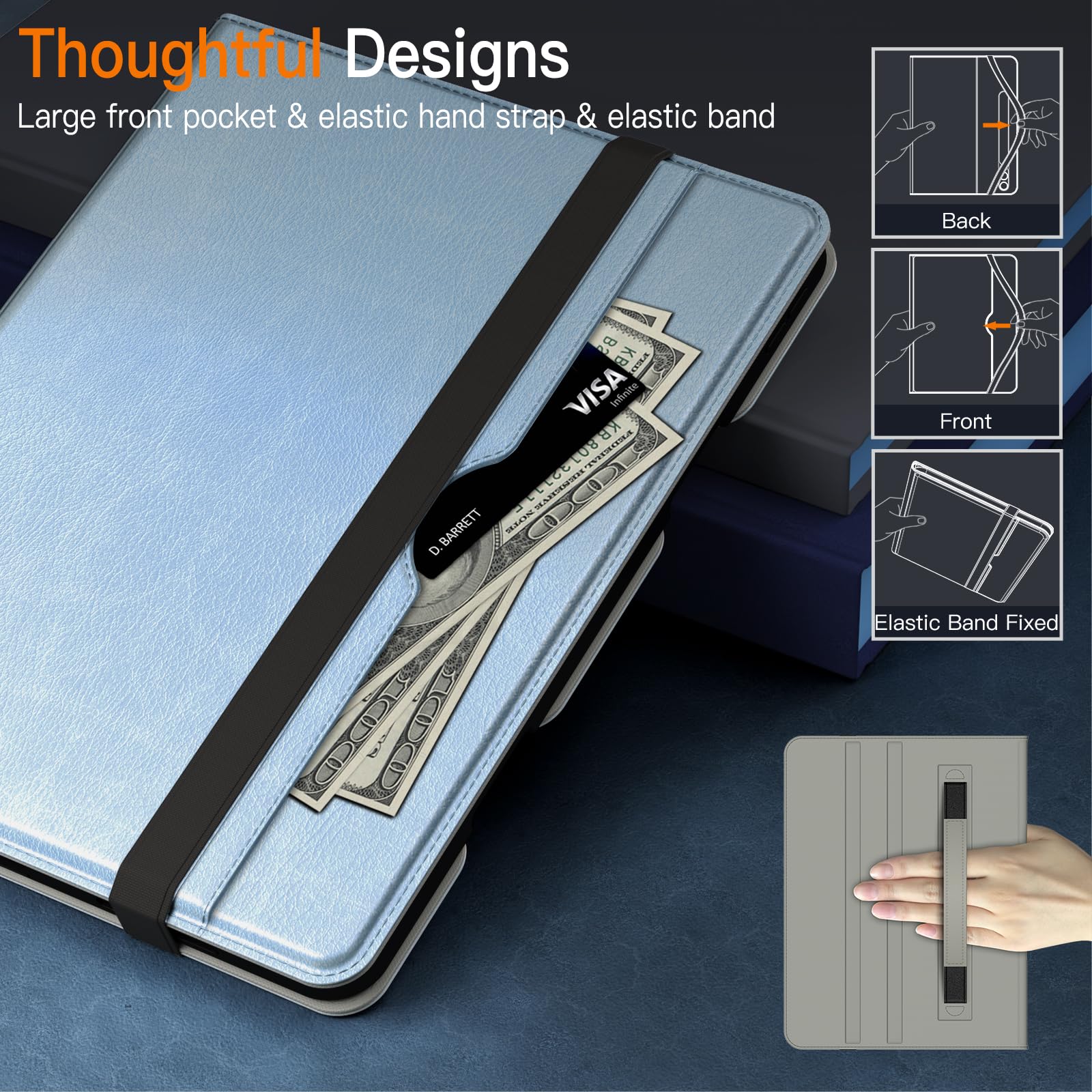 [多機能] カード、現金、メモなどを収納できる大きなフロントポケット。また、iPadをケースにしっかりと固定するための外側の伸縮性のあるストラップが付属しており、調節可能な内側のハンドストラップはiPadをしっかりと保持するのに役立ちます