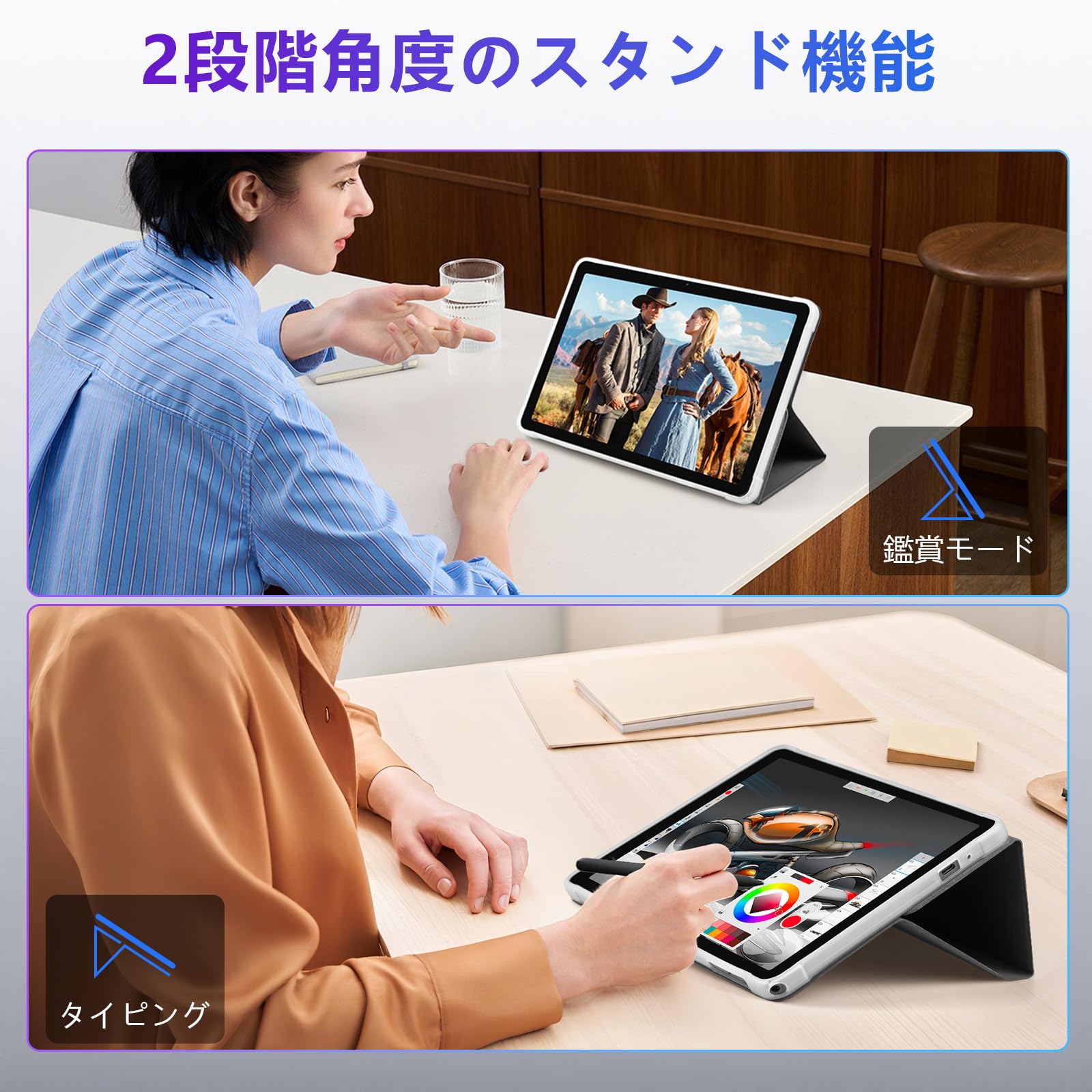 【スタンド機能搭載で快適操作】M30専用ケースは角度調整可能なスタンド機能を備えています。折りたたむだけで、動画視聴やビデオ通話に適した「鑑賞モード」と、文字入力や作業に最適な「タイピングモード」の2つの角度に切り替えられます。使用シーンに合わせて調整できるため、長時間の利用でも疲れにくく快適です。