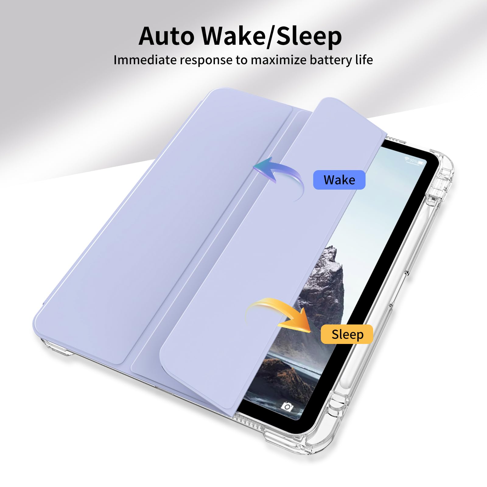 【材料・透明バックカバー】 ケースの表面はPUレザー素材を利用して、軽量、超薄を備えます。ポリカーボネート素材を採用している透明バックカバーは汚れや傷つけなどを防止するだけでなく、iPad本体の色と美しさも活かせます。透明バックカバーの枠は柔軟な TPUを採用して、取り付けも簡単にできます。フロントカバー内部材質はマイクロファイバーで、摩擦によって発生する傷を抑え、液晶画面を保護しきれいに保ちます。(注:透明部分の表裏の保護フィルムを剥がしてください)