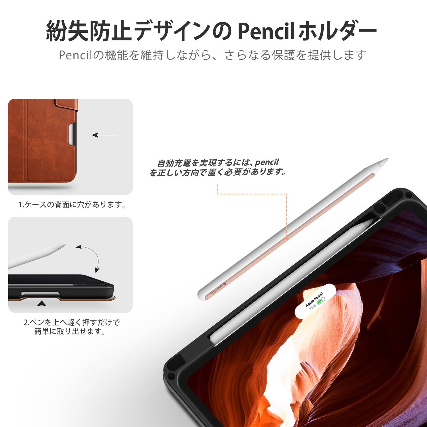 2、【紛失防止のペンホルダー】11インチiPad用のPencilスロットが内蔵されており、これを使えば、ペンをしっかりと保管し紛失を避けることができます。ペンホルダーに入れたままPencilのペアリングとワイヤレス充電を実現できます。ご注意:Pencilは同梱しません。