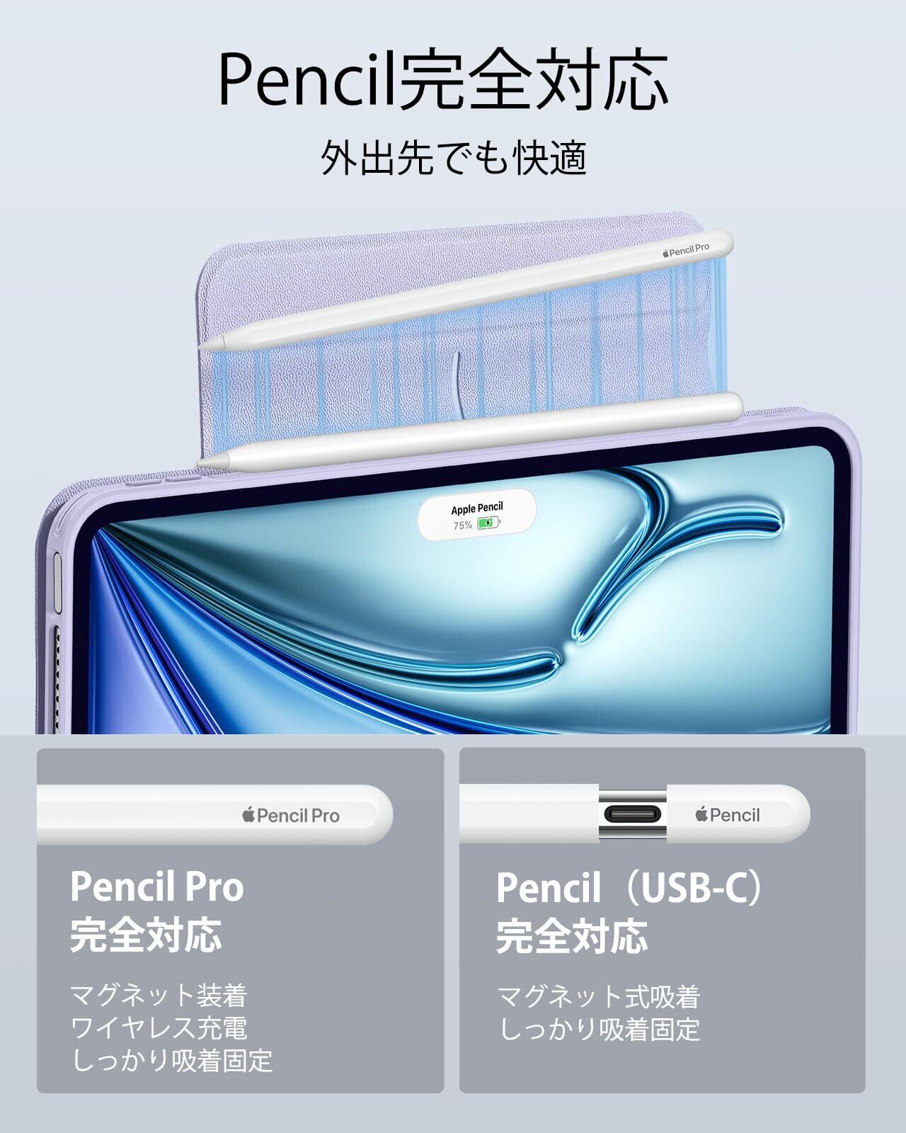 【Pencil Pro&Pencil (USB-C)対応】:Pencil Proへ完全対応かつ、磁気充電用の側面の溝と、Pencilをしっかりと固定するマグネットクラスプを備えています
