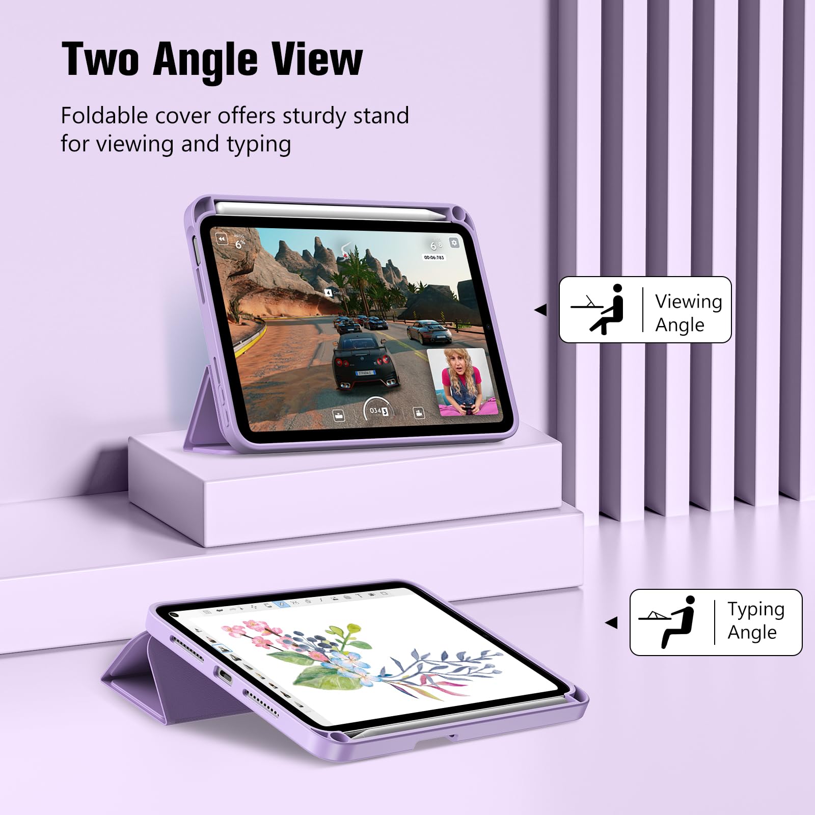 視聴モードとタイピングモード:3つ折りのフロントカバーにより、デバイスを視聴とタイピング時の2つの立ち位置に調整できます。