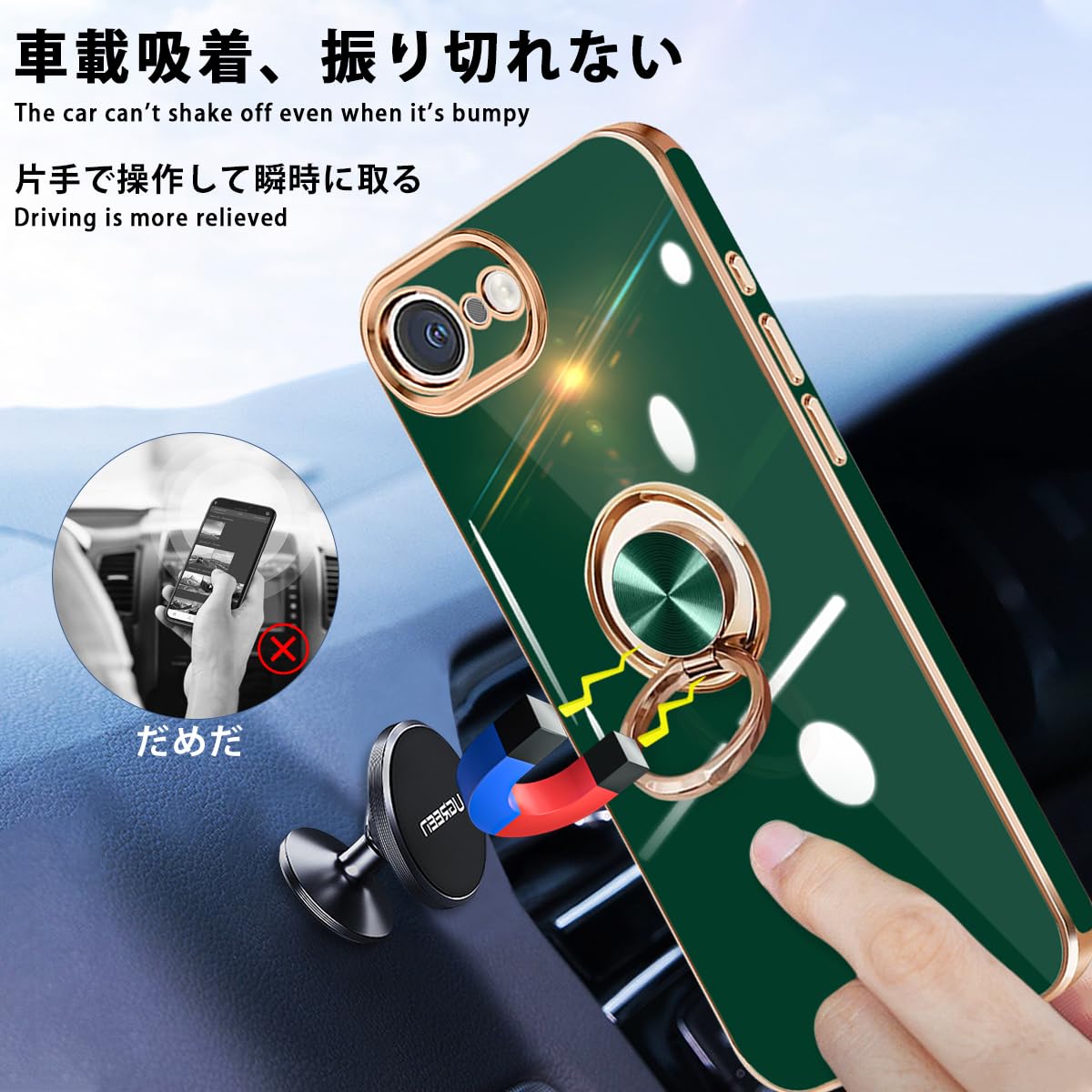 【車載スタンド対応&ストラップ穴付き】内部には金属が内蔵され、マグネット式車載スタンドに対応。*特別ヒント:リング部分は金属ですので、ワイヤレス充電できません。ケースの側面にはストラップホールを搭載しているので、お好きなストラップを付けられ、落下防止にも効果的です。iPhone 16e ケース
