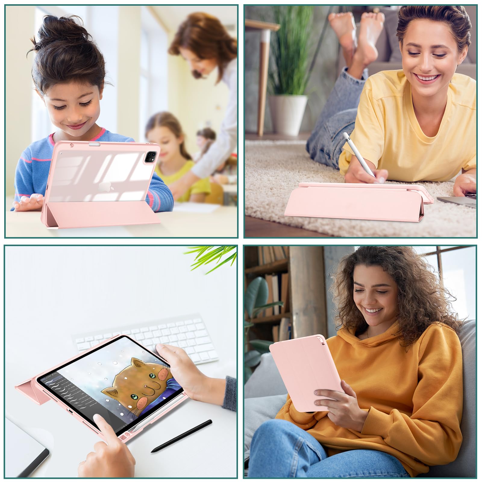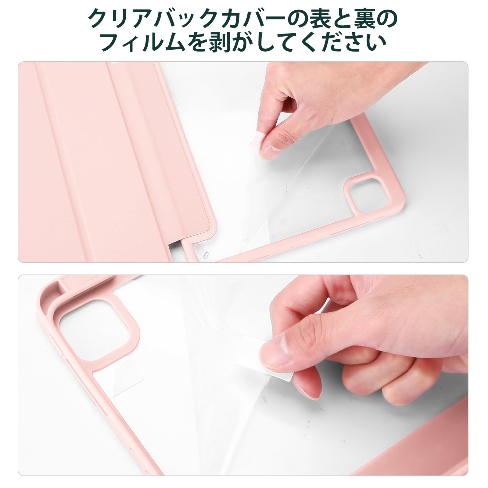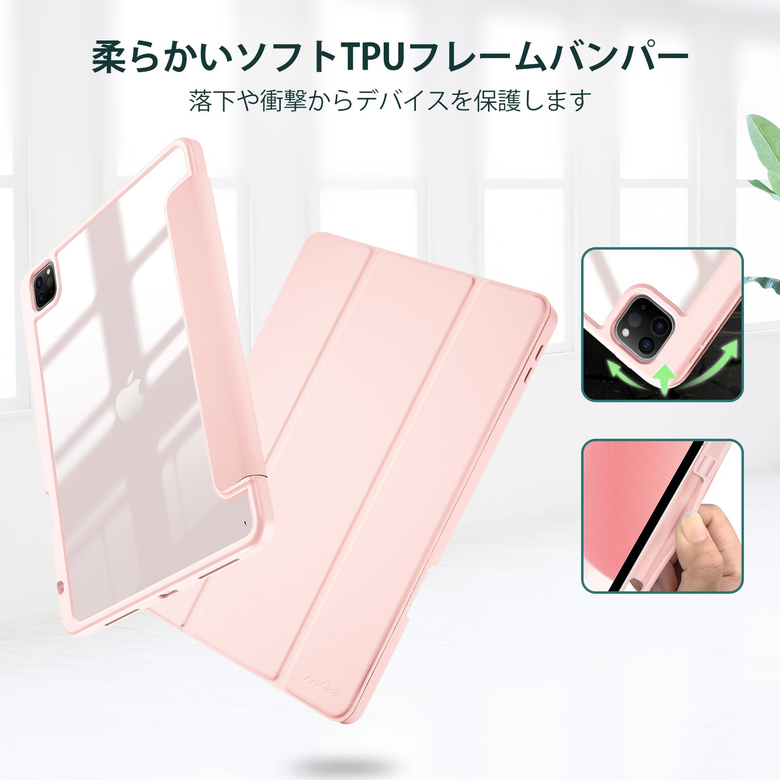 ProCase iPad Pro 12.9 ケース 第6/5/4/3世代に適用(2022 2021 2020 2018) 透明 クリアバックカバー ペン収納 耐衝撃 三つ折り スタンド スマートカバー - ピンク