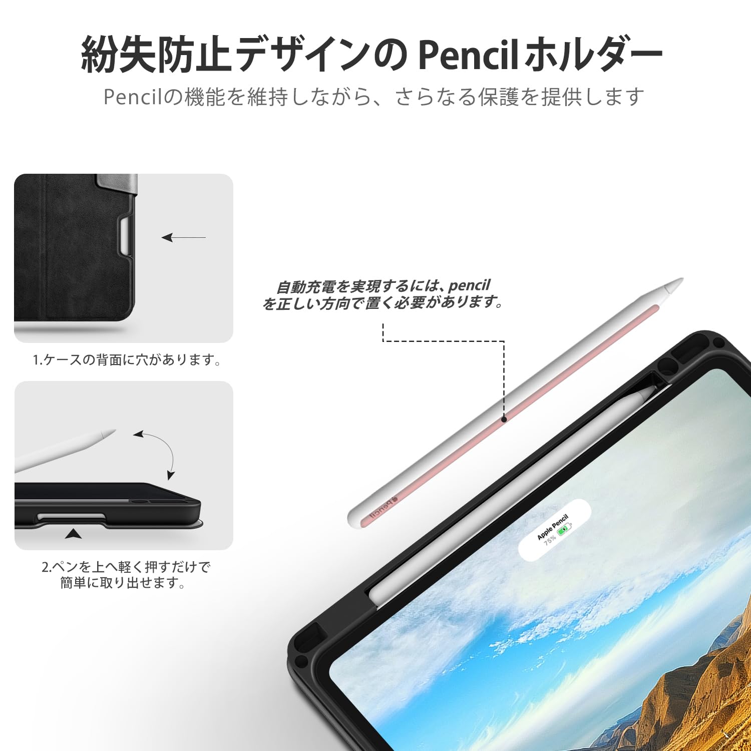 2、【紛失防止のペンホルダー】11インチiPad用のPencilスロットが内蔵されており、これを使えば、ペンをしっかりと保管し紛失を避けることができます。ペンホルダーに入れたままPencilのペアリングとワイヤレス充電を実現できます。ご注意:Pencilは同梱しません。
