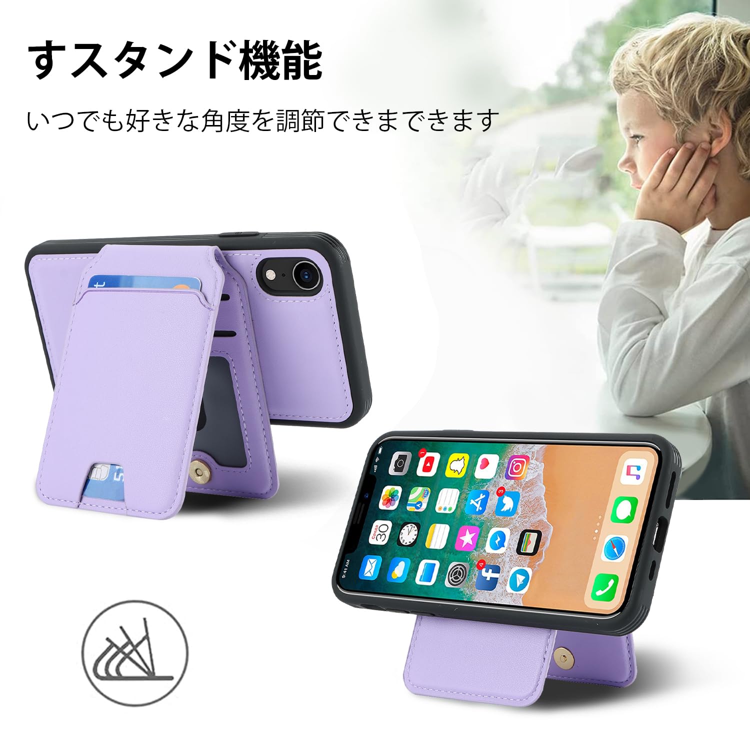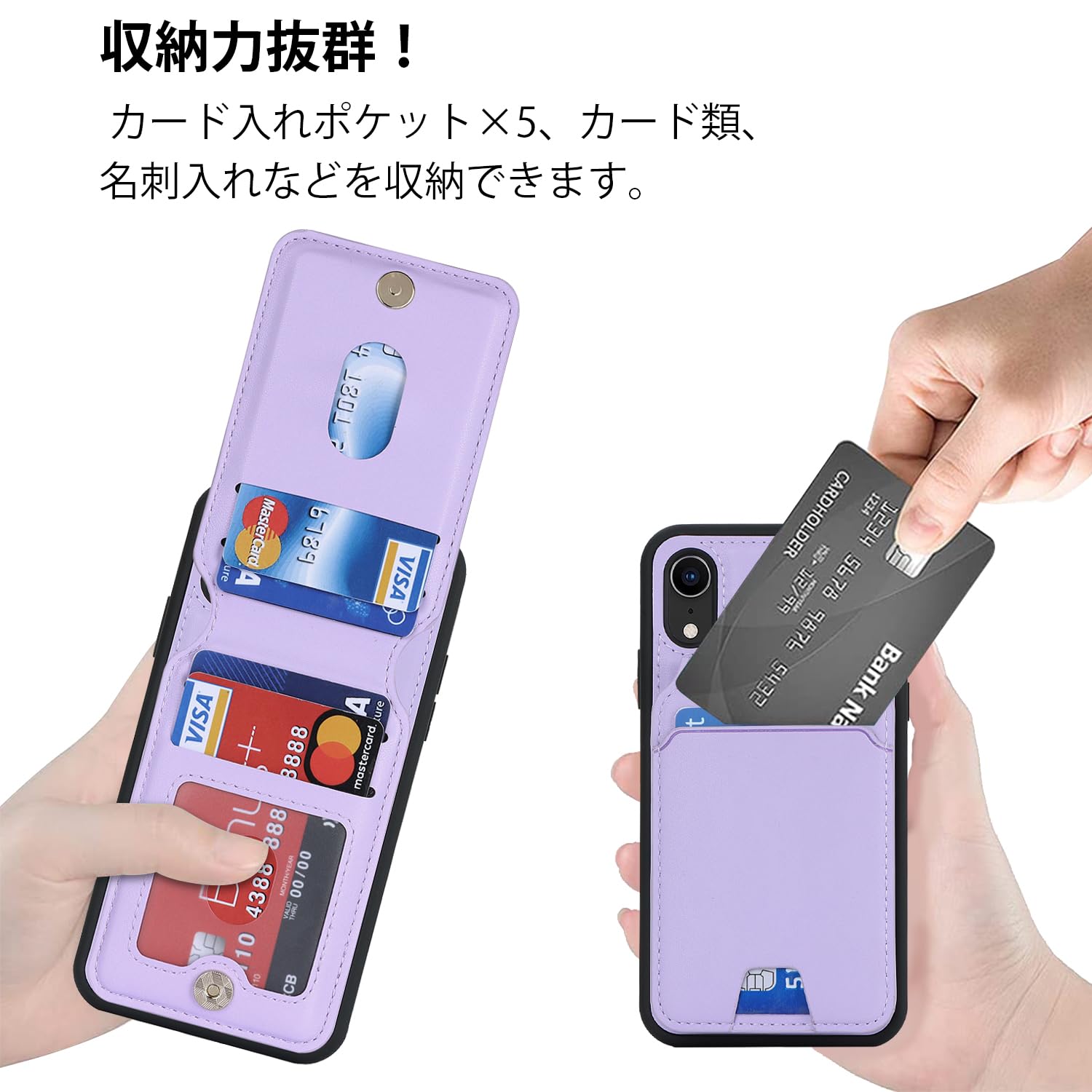 【リムーバブルカードケース】◀ケース背面には取り外し可能な磁気吸引カードケースが付属し、カードを5枚収納できる。たとえば、スイカカードなどの毎日の重要なカードや現金は簡単に保管できます。iPhoneシリーズ専用に設計されているので、ケースを装着したまま、音量ブボタン、カメラ、コネクターなどのを自由に使えます。実用性が高いです。◀横置きスタンド機能:取り外し可能なカードスロットは、横画面でも縦画面でも簡単に実現できる携帯電話スタンドに簡単に変換できます。映画を見たり読んだりすることで手を解放できます。