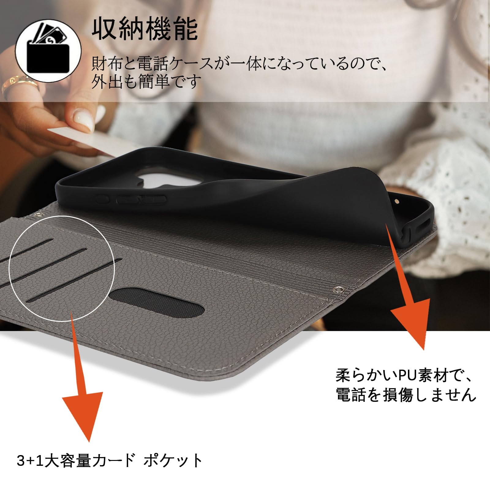 【収納機能】ケース内側に実用性のカード入れポケット×3、内側ポケット×1。カード類や紙幣 、名刺、免許証などを入れることができ、日常の生活に便利。