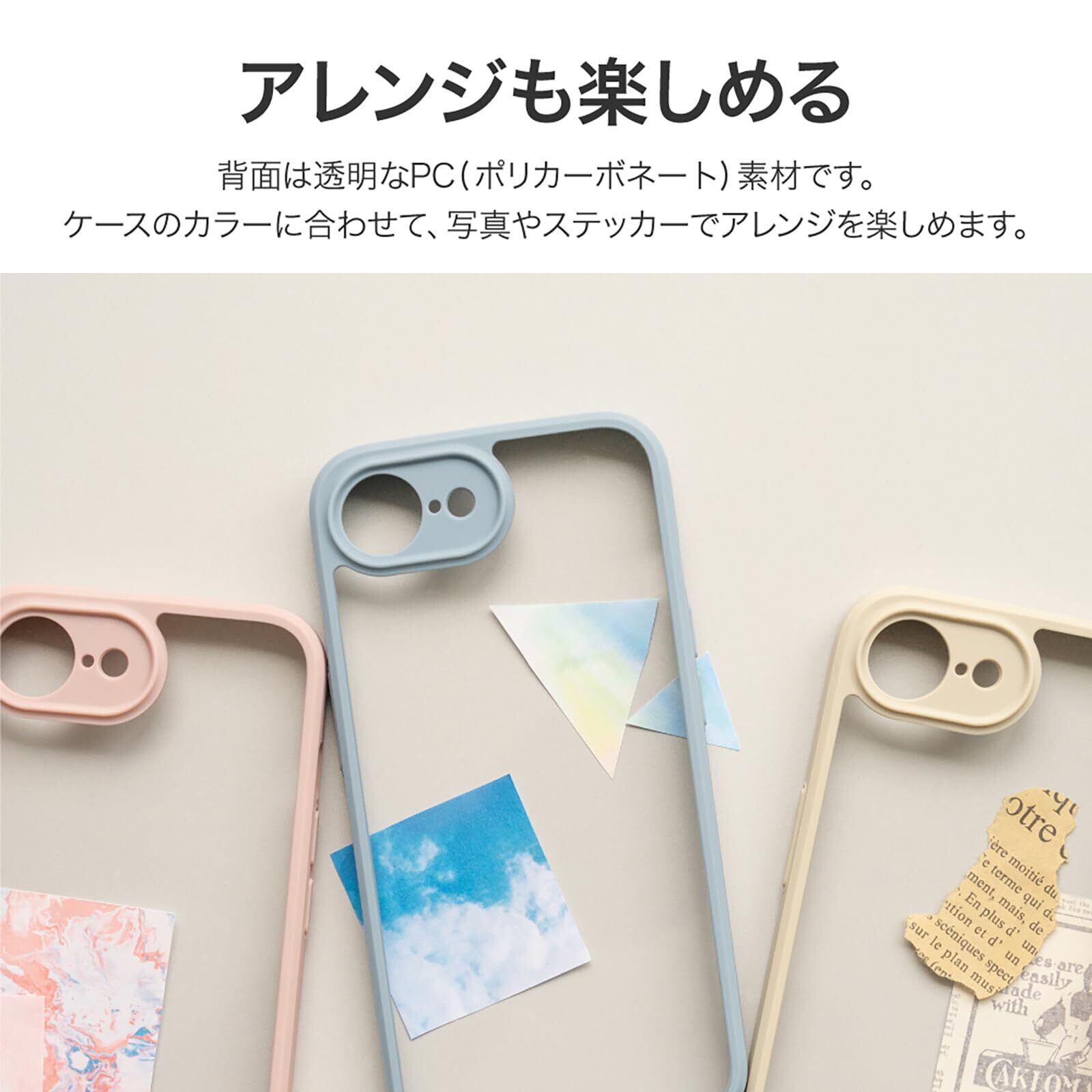 写真やステッカーを使ったアレンジも楽しめる背面クリア仕様/ストラップホール搭載