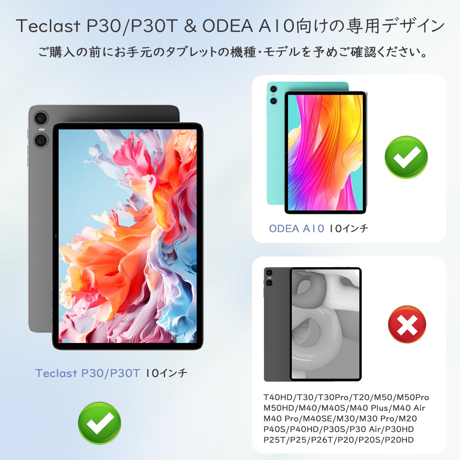 「テクラスト P30T/P30/ODEA A10向け」 テクラスト P30T / P30 / ODEA A10向けの専用デザインです。他の機種に対応できませんので、ご購入前にお使いのタブレットのモデル番号を確認してください。