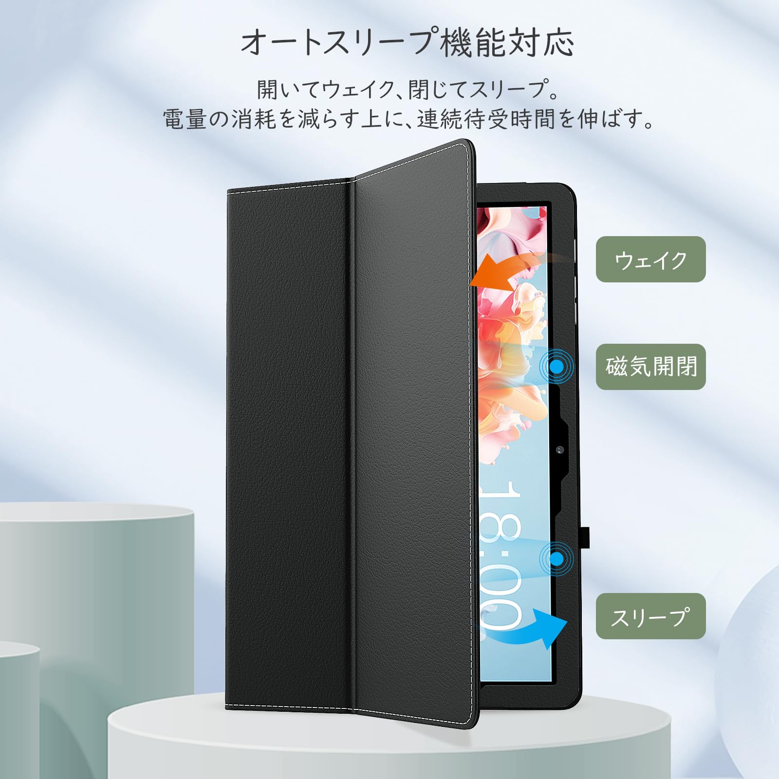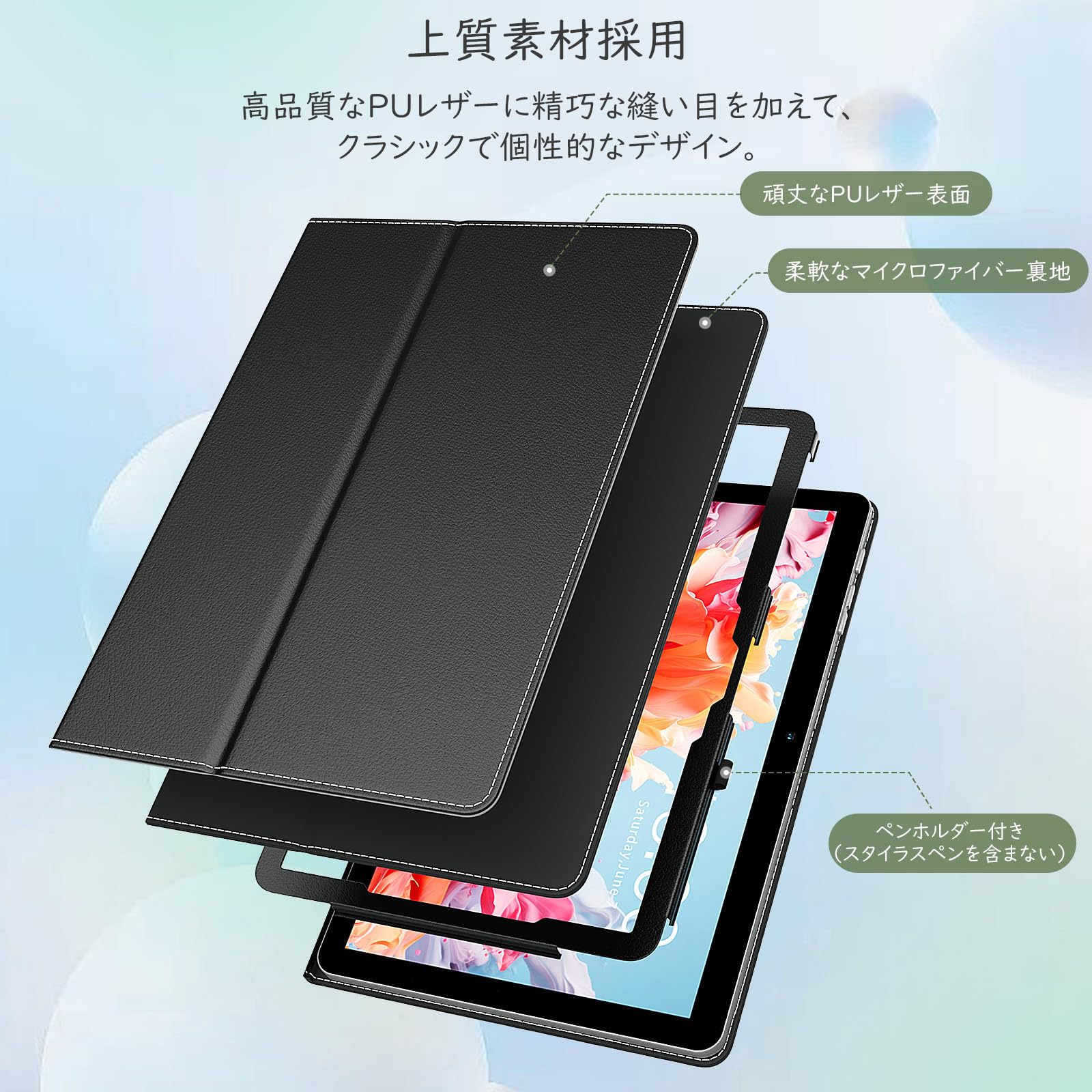 「PUレザー表面素材」 ケースの表面は上質なPUレザー素材を採用しており、手触りが良く、不意の扱いに落下しても衝撃を有効的最小限に抑えられて、タブレット本体を傷つきや汚れからしっかりと保護できます。裏は柔軟なマイクロファイバー生地を採用し、画面をスクラッチなどから優しく守ってくれます。