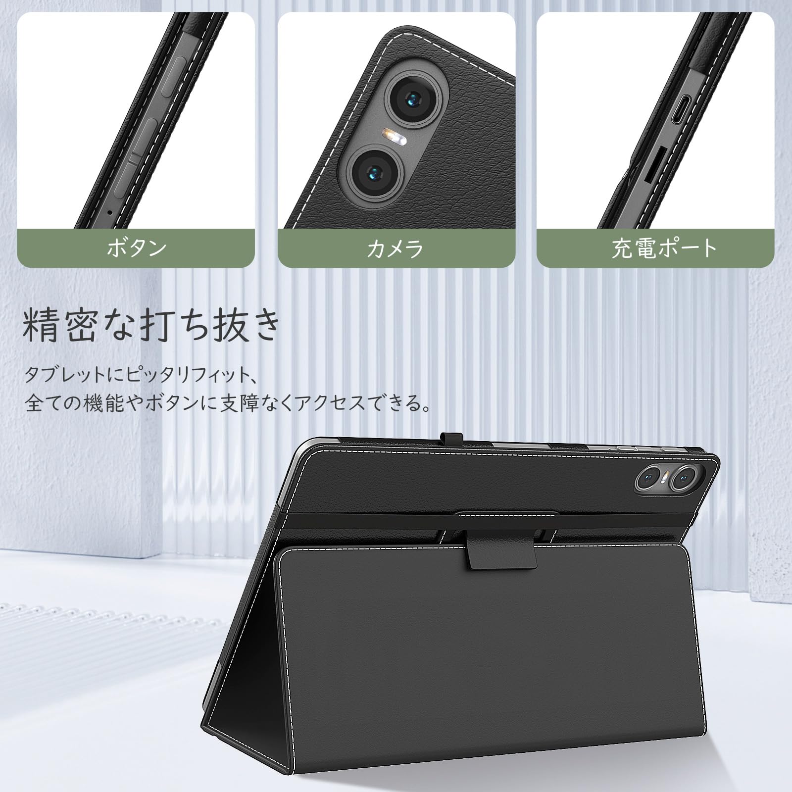「精密な打ち抜き」 充電差込口、電源ボタン、音量調節ボタン、イヤホン口などはきれいに加工されており、ケースを装着したままでもタブレット本体の各操作が可能です。