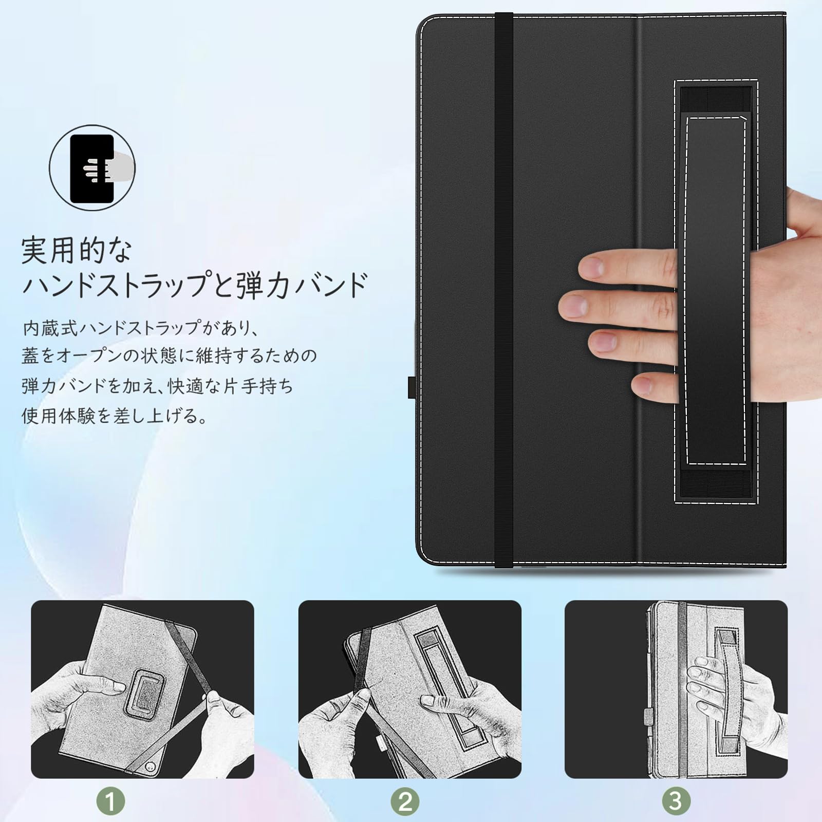「片手操作可能」 フロントカバーの裏に手持ち用のハンドストラップが設計されており、片手で持ってメモを取ったり、会議などの時に大変役に立ちます。