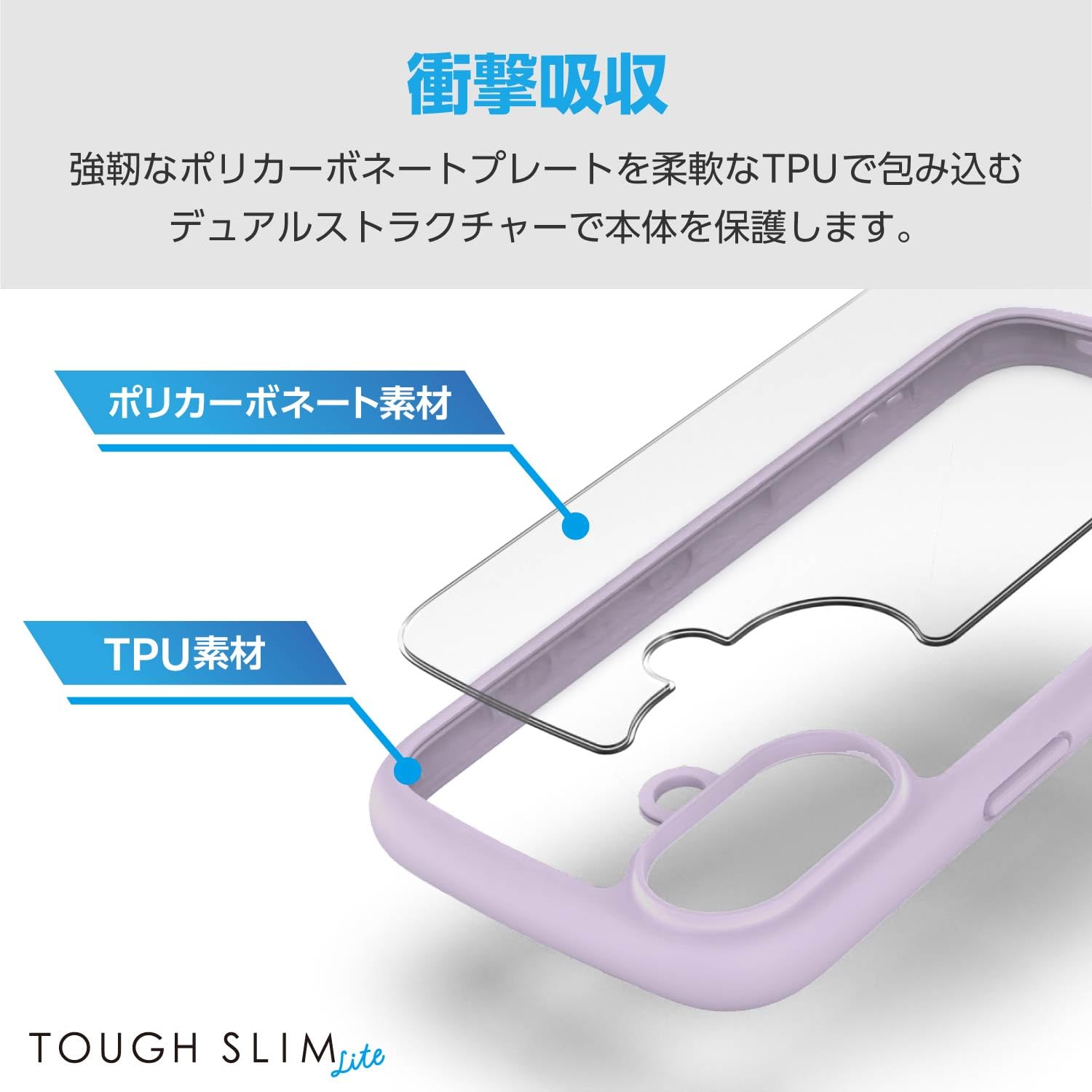 ■全周に配置した独自設計のエアークッションが衝撃を吸収します。背面には高硬度のポリカーボネートに指紋が付きにくい特殊加工を採用した、TOUGH SLIM LITEケースです。
