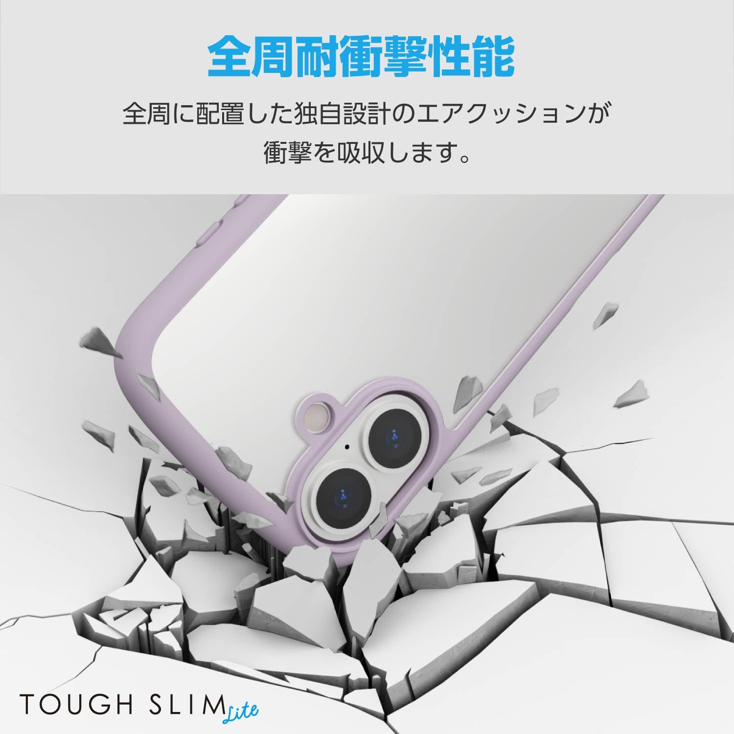 全周に配置した独自設計のエアークッションが衝撃を吸収します。背面には高硬度のポリカーボネートに指紋が付きにくい特殊加工を採用した、TOUGH SLIM LITEケースです。