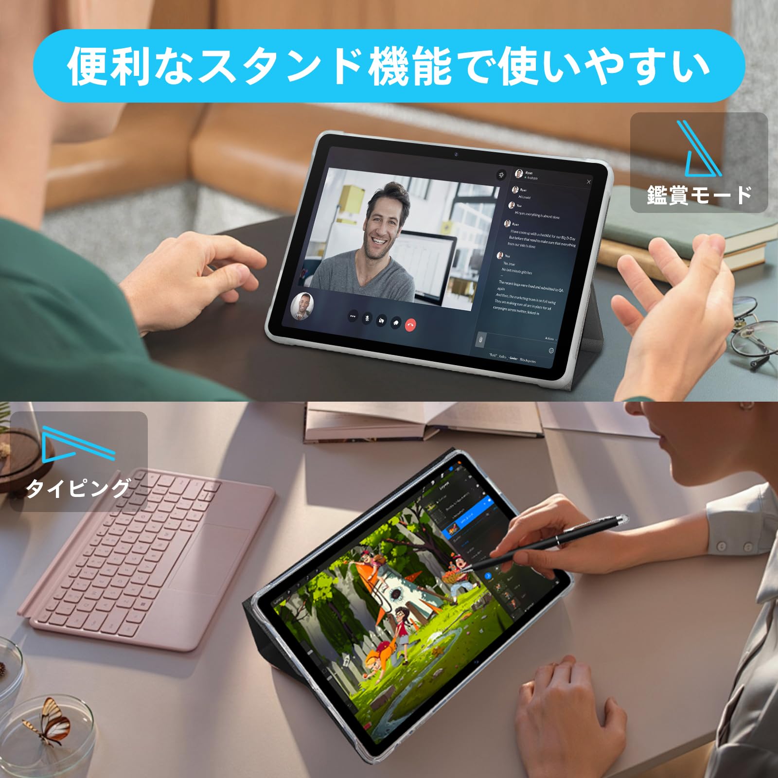 【2角度のスタンド機能】:A60保護ケースは、フラップを折りたたむことでスタンドとして使用できます。スタンドとして使用する際には、メールなどの文字入力に便利な「タイピング」と、動画視聴に最適な「鑑賞モード」が選べます。置き方を調整することで、最適な角度に変更でき、文字入力や動画視聴など、さまざまなシーンで活躍します。
