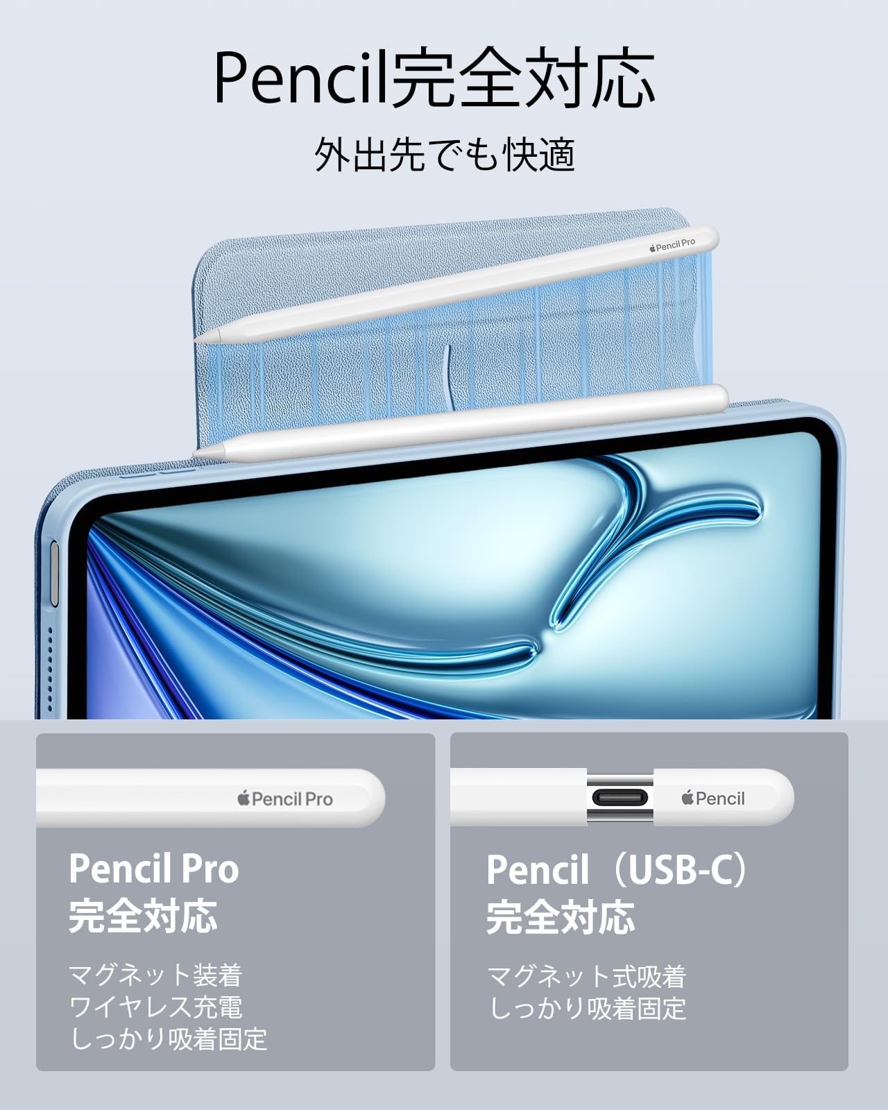 【Pencil Pro&Pencil (USB-C)対応】:Pencil Proへ完全対応かつ、磁気充電用の側面の溝と、Pencilをしっかりと固定するマグネットクラスプを備えています
