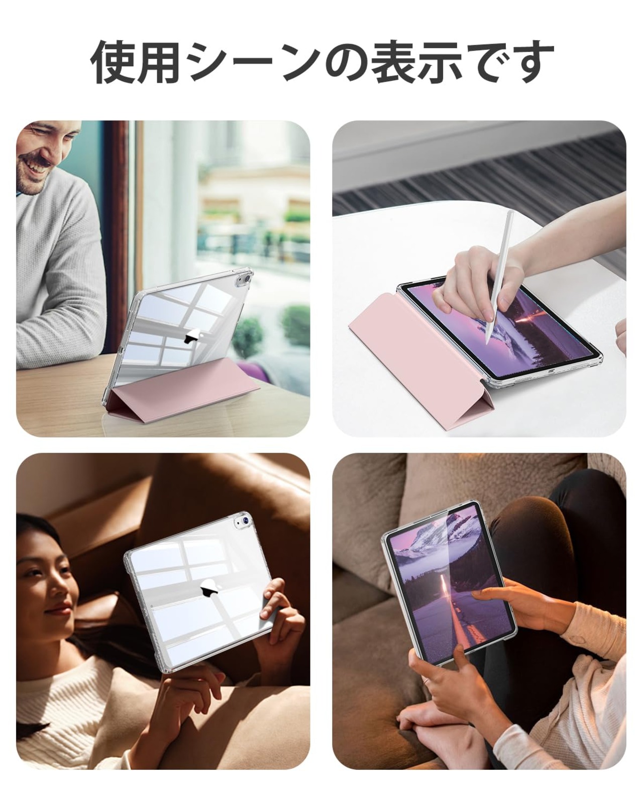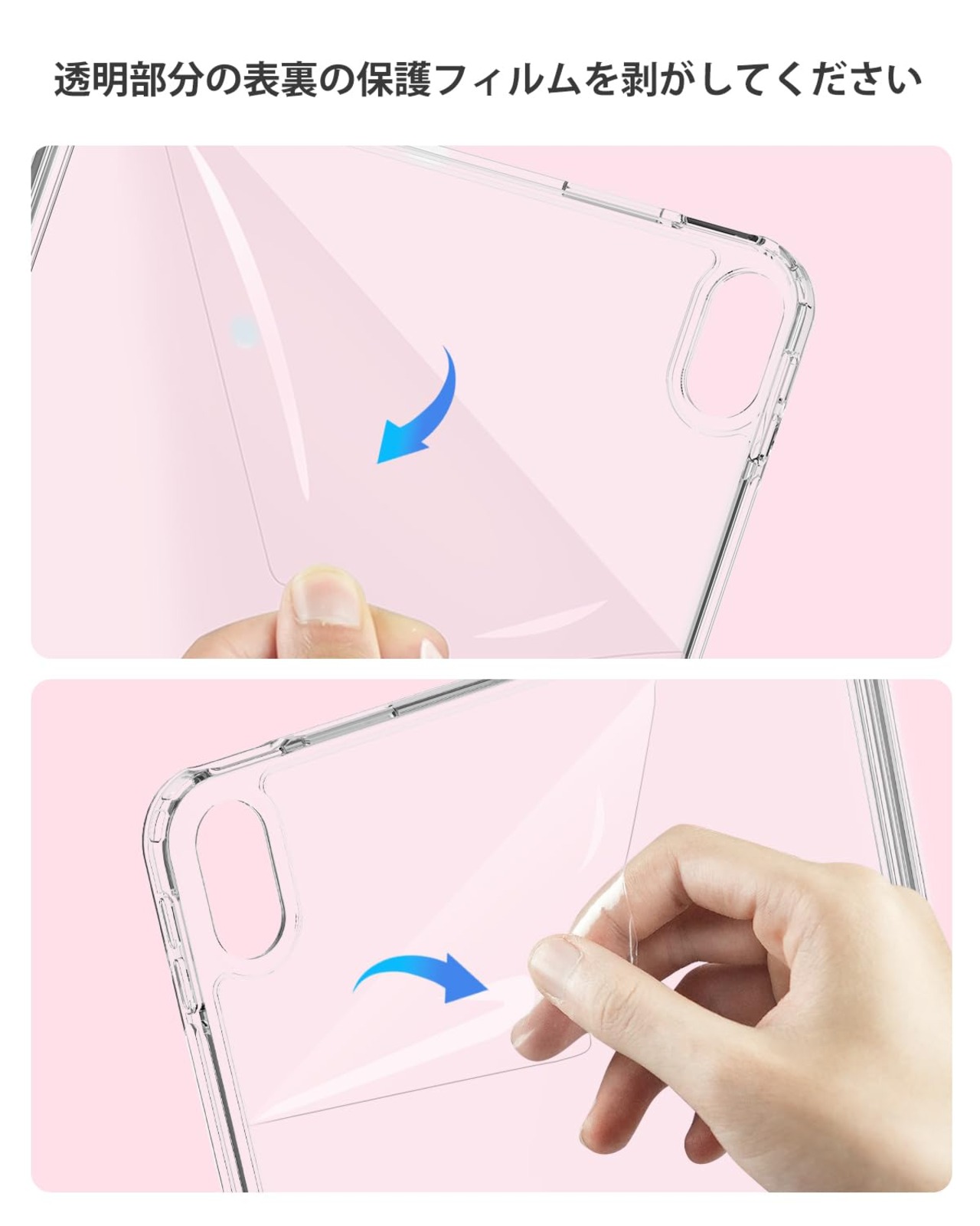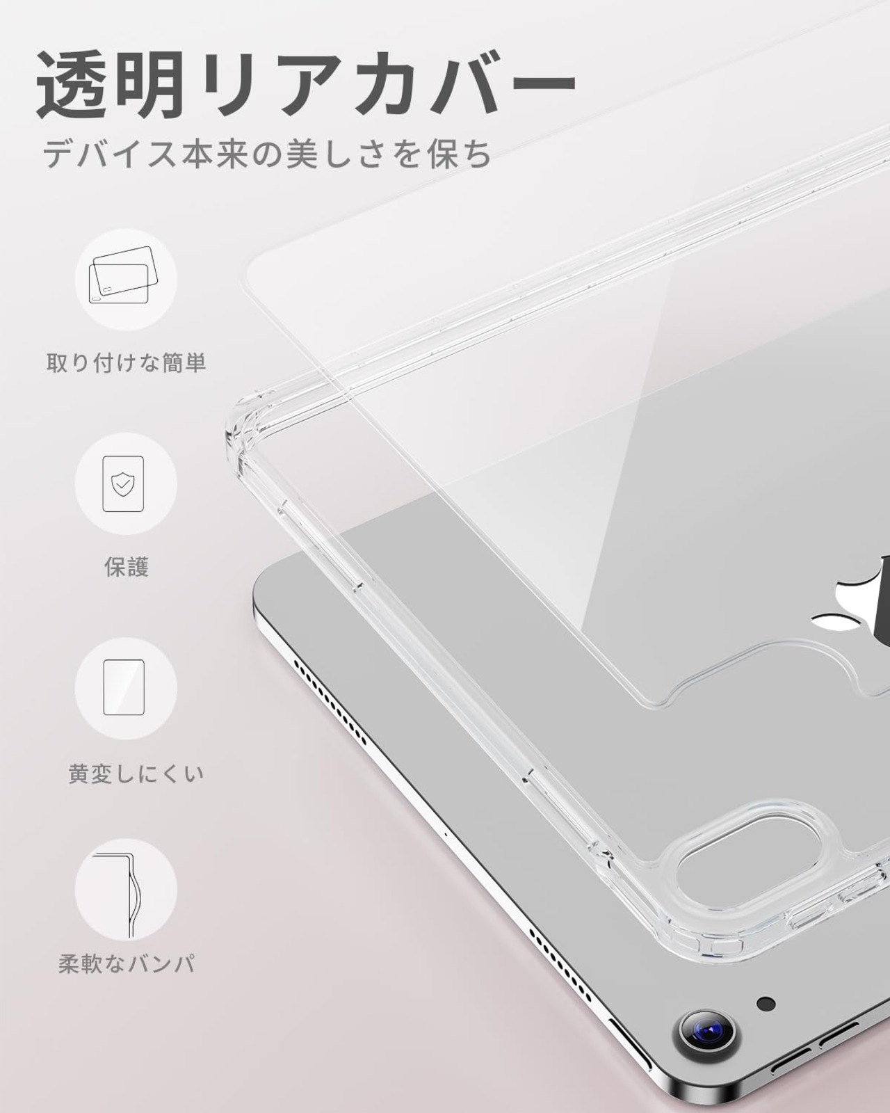 【材料・透明バックカバー】 ケースの表面はPUレザー素材を利用して、軽量、超薄を備えます。ポリカーボネート素材を採用している透明バックカバーは汚れや傷つけなどを防止するだけでなく、iPad本体の色と美しさも活かせます。透明バックカバーの枠は柔軟な TPUを採用して、取り付けも簡単にできます。フロントカバー内部材質はマイクロファイバーで、摩擦によって発生する傷を抑え、液晶画面を保護しきれいに保ちます。