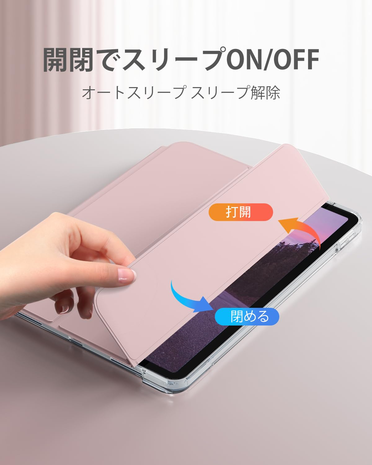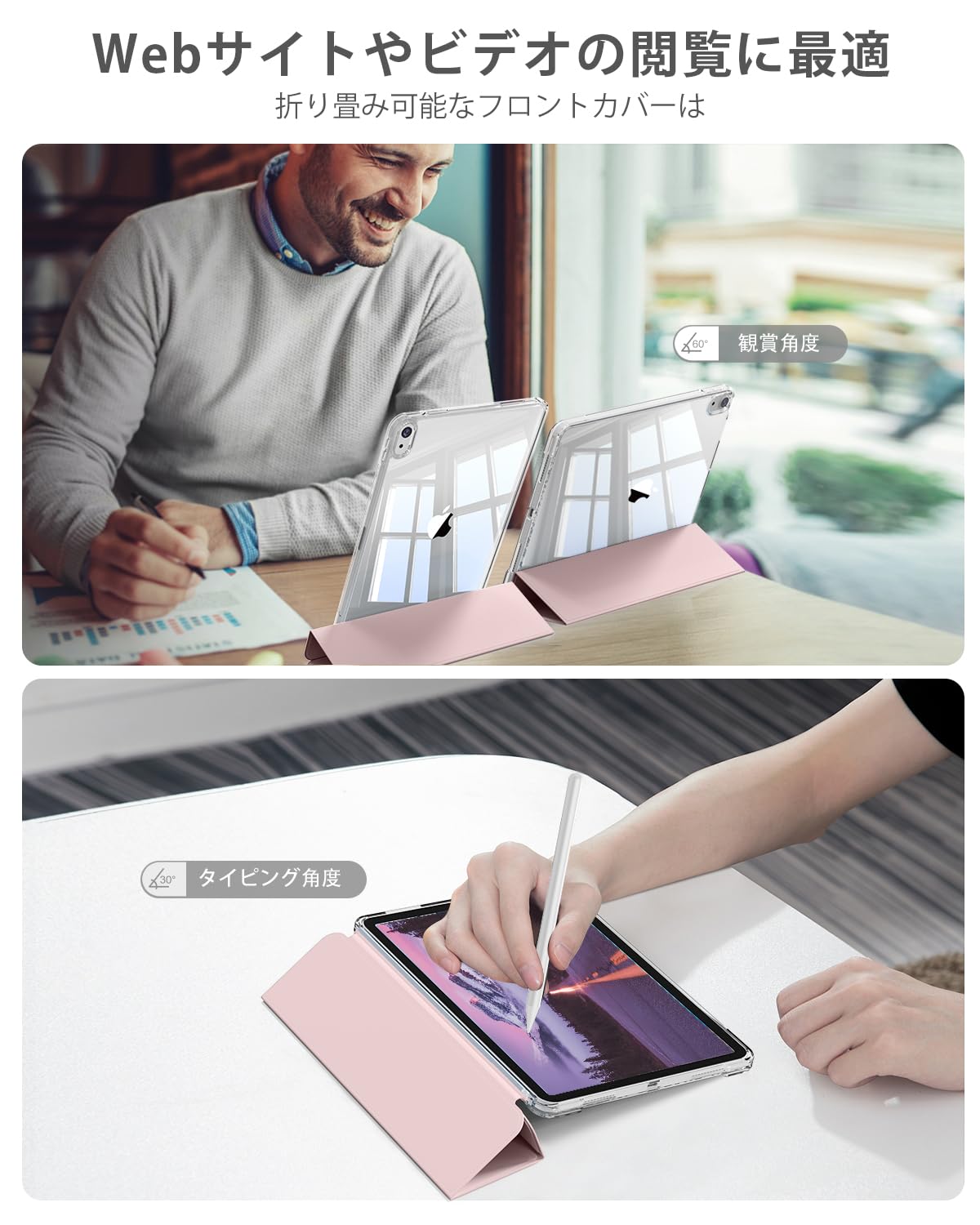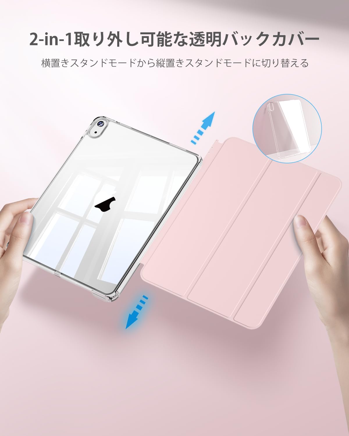 【材料・透明バックカバー】 ケースの表面はPUレザー素材を利用して、軽量、超薄を備えます。ポリカーボネート素材を採用している透明バックカバーは汚れや傷つけなどを防止するだけでなく、iPad本体の色と美しさも活かせます。透明バックカバーの枠は柔軟な TPUを採用して、取り付けも簡単にできます。フロントカバー内部材質はマイクロファイバーで、摩擦によって発生する傷を抑え、液晶画面を保護しきれいに保ちます。