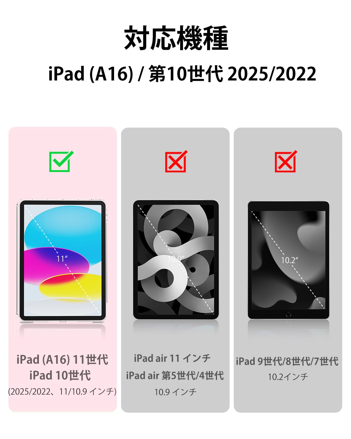 【対応機種】 iPad (A16) 11世代 2025、iPad 10.9インチ 第10世代 2022(モデル番号:A2696/A2757/A2777) 専用スマートケース、カバー。(ご注意:iPadの他のモデルには対応していません、ご注文の際に、 お手元機種の背面にあるモデル番号を確認をお願い致します。)