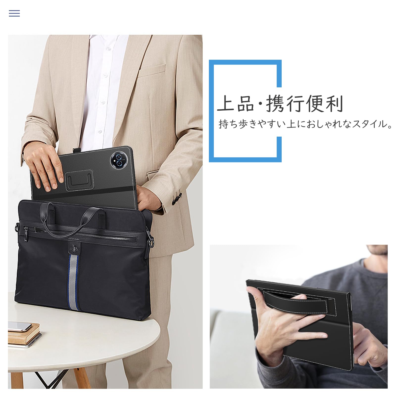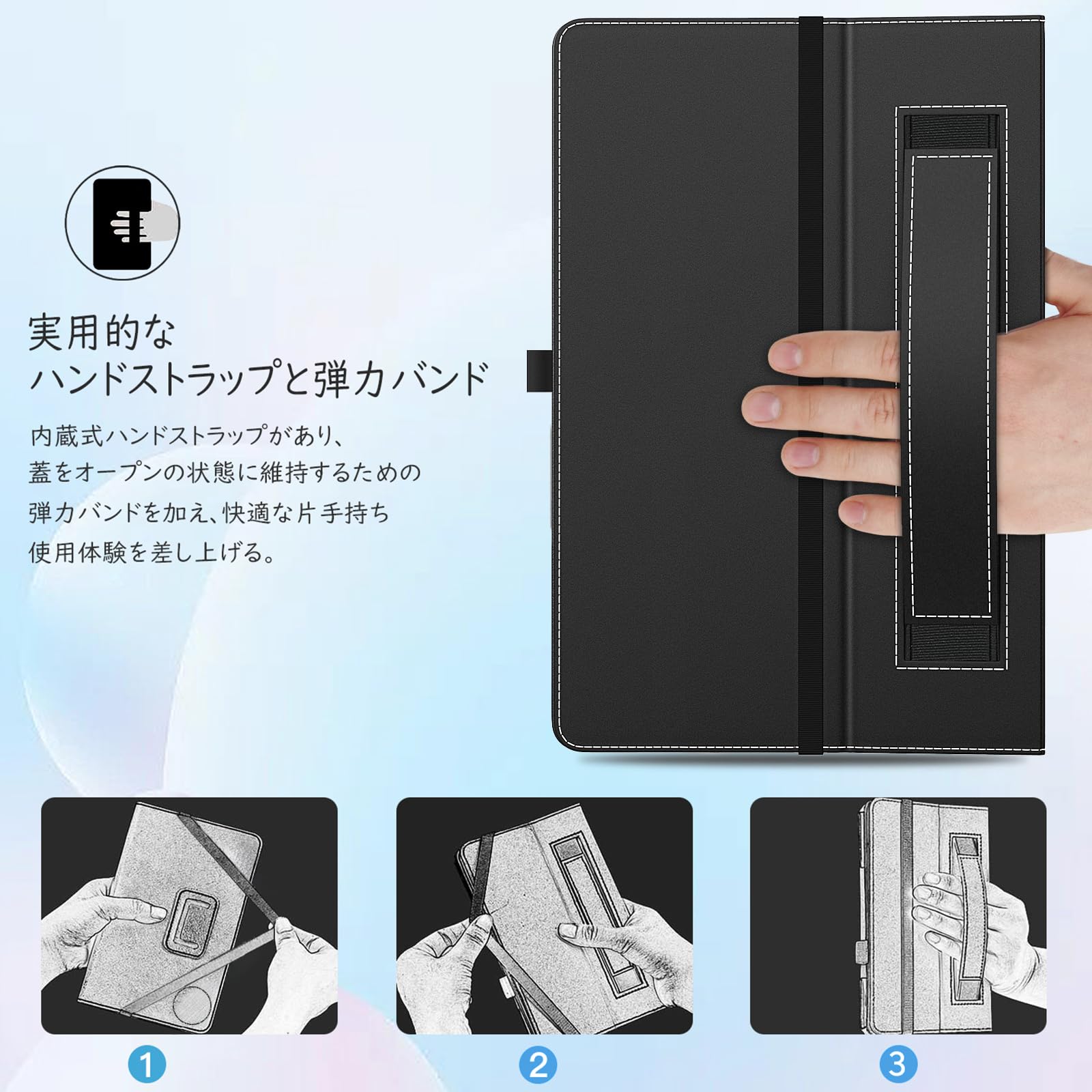 「片手操作可能」 フロントカバーの裏に手持ち用のハンドストラップが設計されており、片手で持ってメモを取ったり、会議などの時に大変役に立ちます。