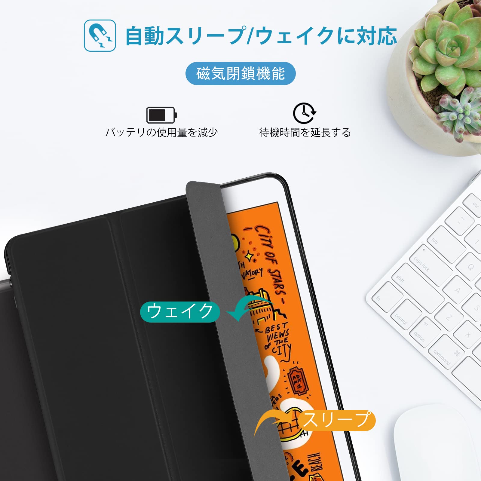 【自動睡眠・喚起】オートスリープ/ウェイクに対応します;マグネットがケースクロージャーを固定し、開閉も簡単。