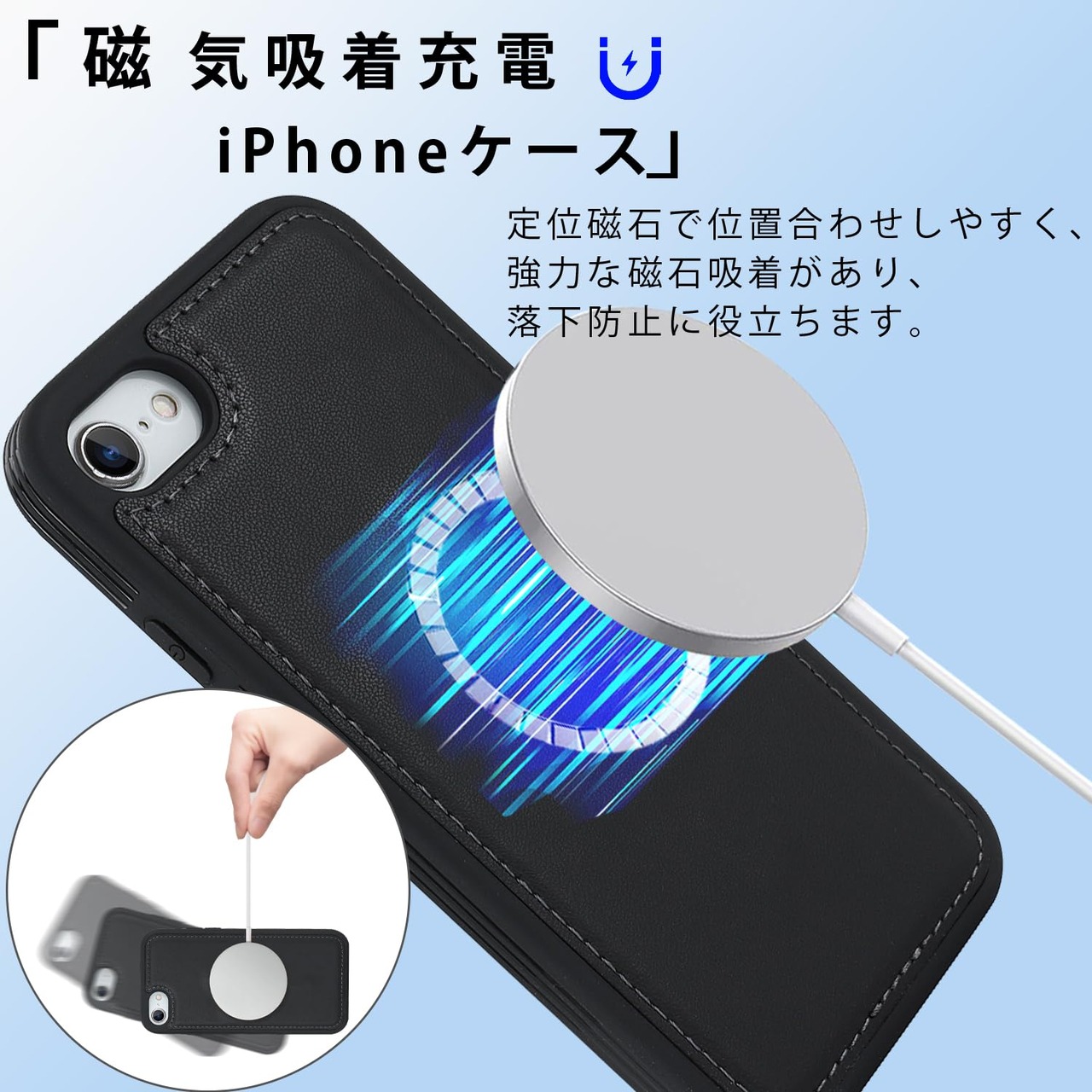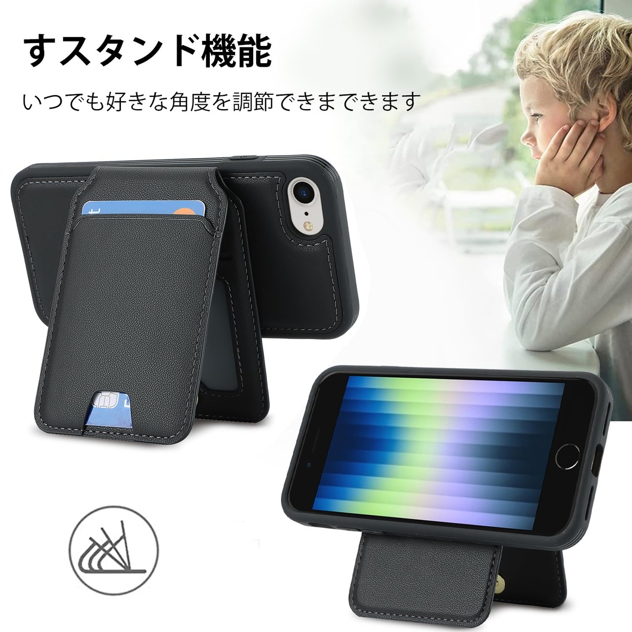 【リムーバブルカードケース】◀ケース背面には取り外し可能な磁気吸引カードケースが付属し、カードを5枚収納できる。たとえば、スイカカードなどの毎日の重要なカードや現金は簡単に保管できます。iPhoneシリーズ専用に設計されているので、ケースを装着したまま、音量ブボタン、カメラ、コネクターなどのを自由に使えます。実用性が高いです。◀横置きスタンド機能:取り外し可能なカードスロットは、横画面でも縦画面でも簡単に実現できる携帯電話スタンドに簡単に変換できます。映画を見たり読んだりすることで手を解放できます。