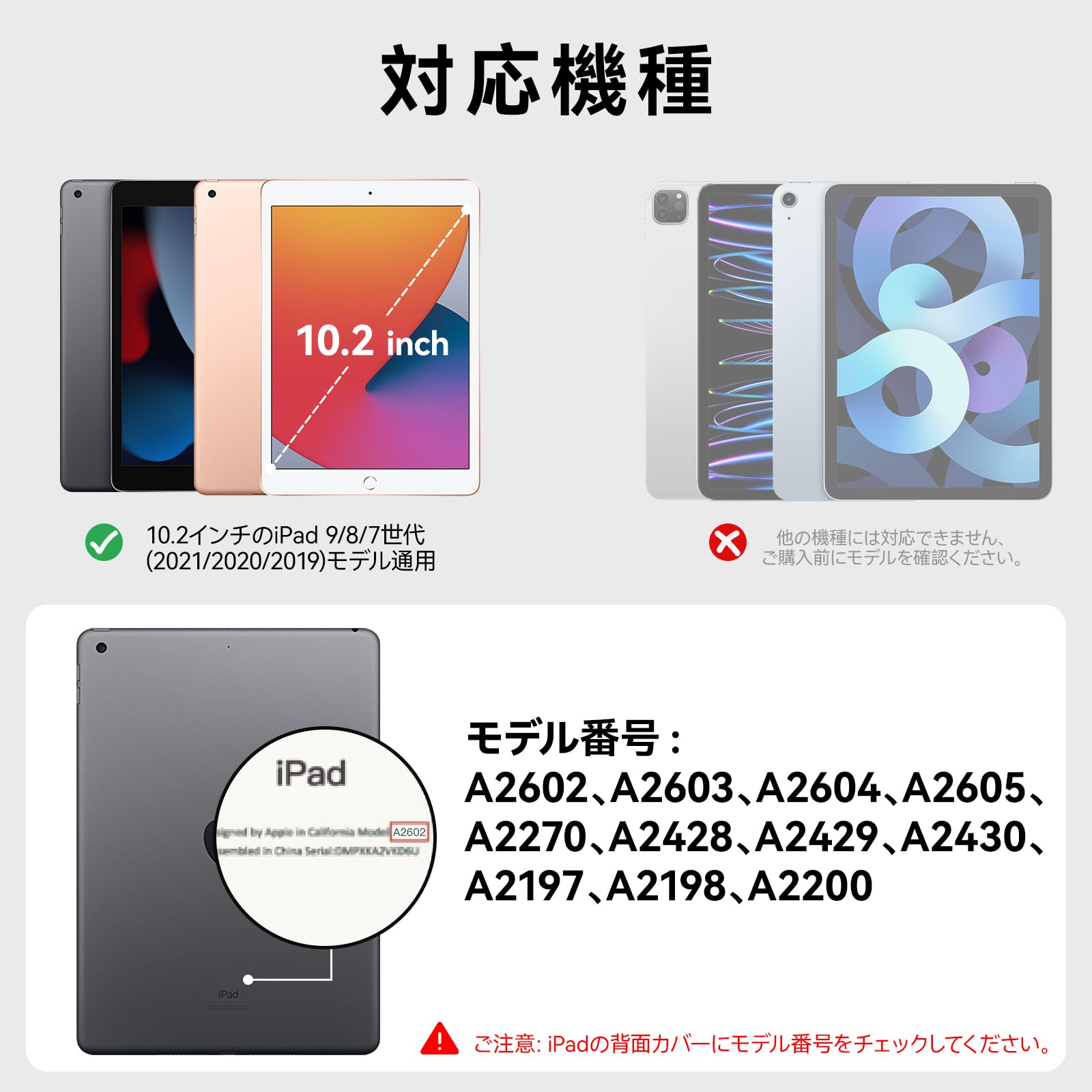 ღ「対応機種」iPad第9世代 2021(A2602、A2603、A2604、A2605)/iPad 第8世代 2020(A2270、A2428、A2429、A2430)/iPad 第7世代 2019(A2197、A2198、A2200) 10.2インチ専用です。 その他の型式に適用されません。ご購入前、お持ちのiPadのモデル番号をご確認いただきます。
