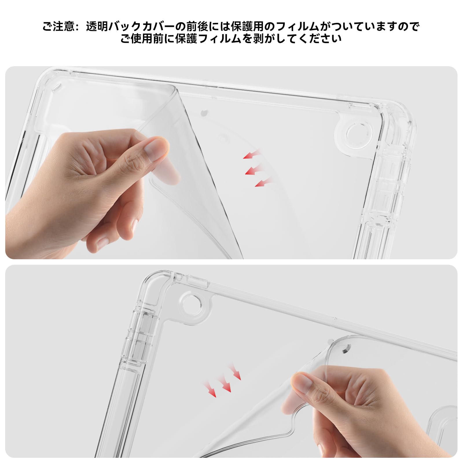 ღ「透明デザイン&柔らかい素材」柔軟なTPUフレームと透明なPCハードバックカバーで作られ、汚れや傷つけなどを防止できるだけでなく、iPad本体の色と美しさも活かせます。また、お好みで写真やステッカーなどをデバイスとケースの間に入れて、マイスタイルケースが創ります。 (ご注意:透明バックカバーの前後には保護用のフィルムがついていますので、ご使用前に保護フィルムを剥がしてください。)